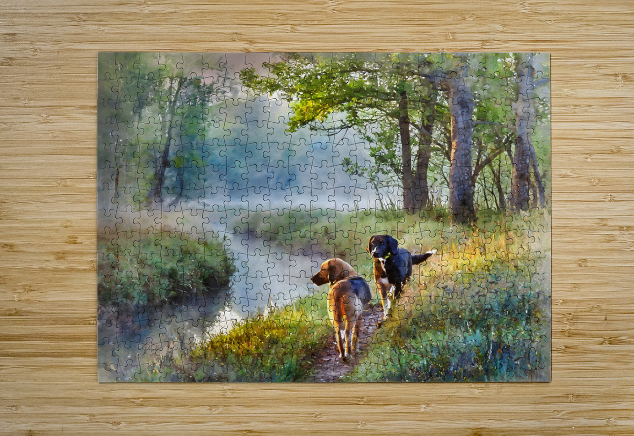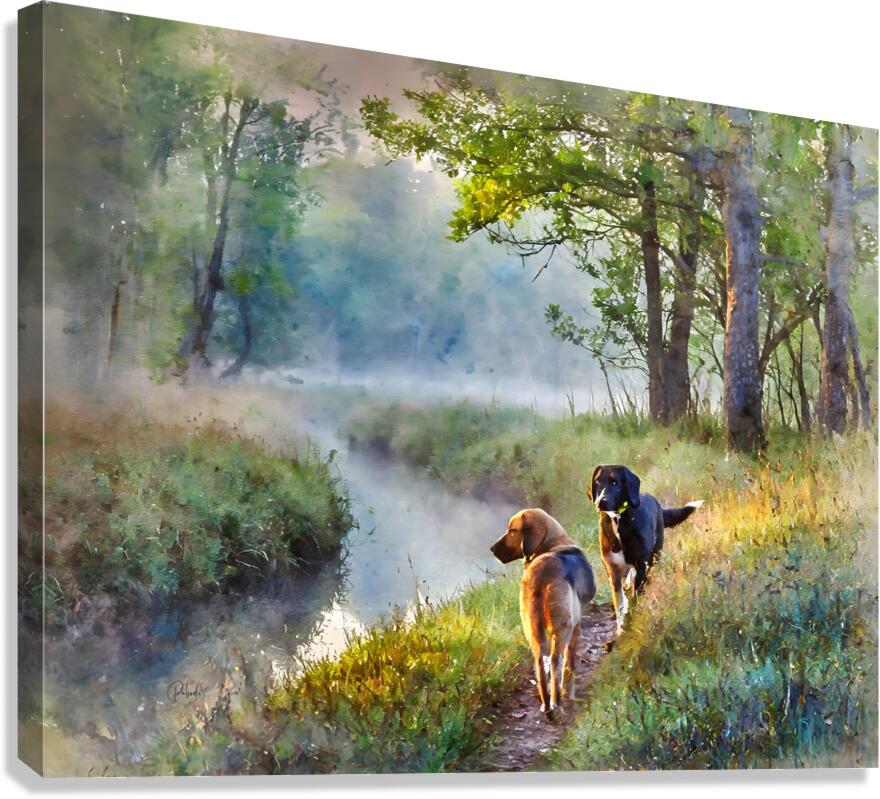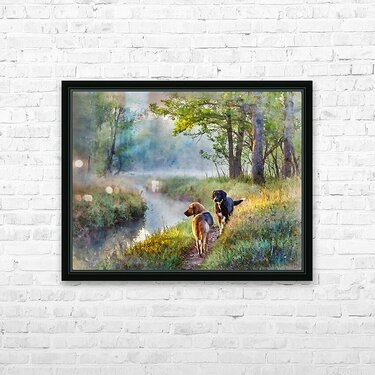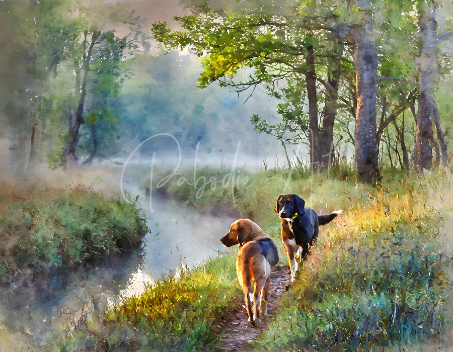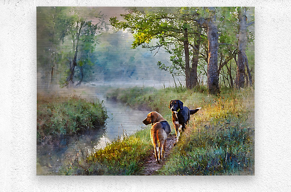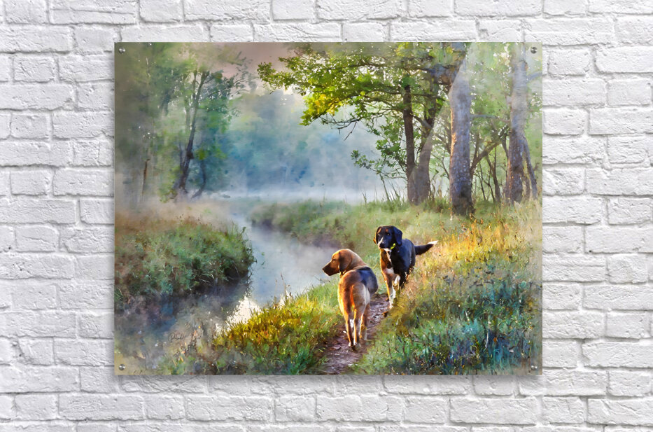 These two fine canines are off on their morning adventure looking for anything and everything that catches their attention. The will meander along the creek bed until a small animal spooks and then they will be off chasing it into the trees. Its all in a days work and they are living their best life! Choose your perfect size and media and bring these awesome dogs into your home or office today.