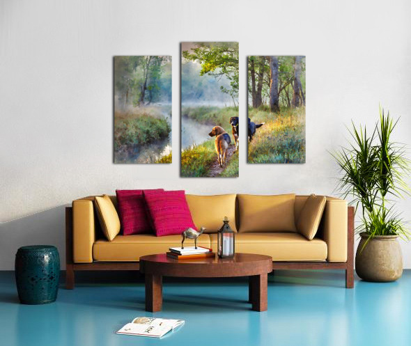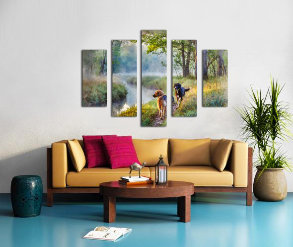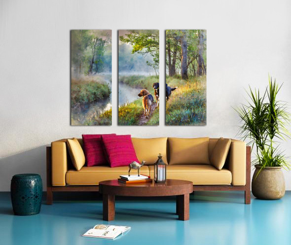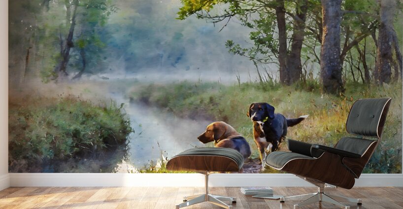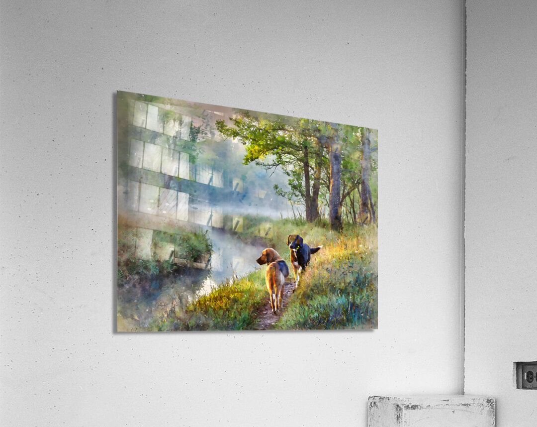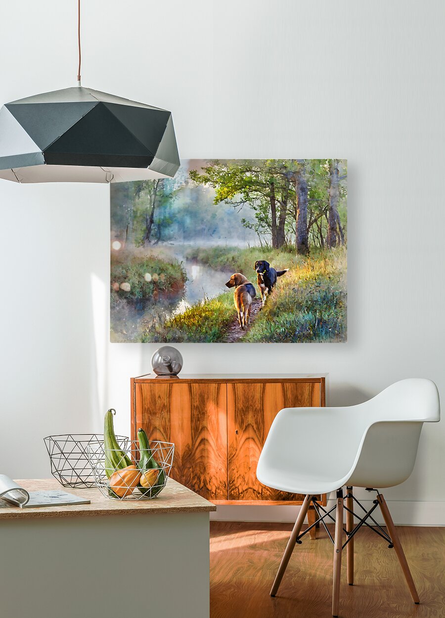 These two fine canines are off on their morning adventure looking for anything and everything that catches their attention. The will meander along the creek bed until a small animal spooks and then they will be off chasing it into the trees. Its all in a days work and they are living their best life! Choose your perfect size and media and bring these awesome dogs into your home or office today.