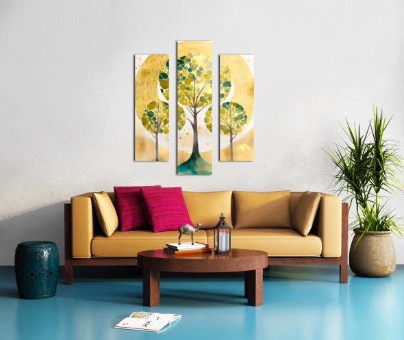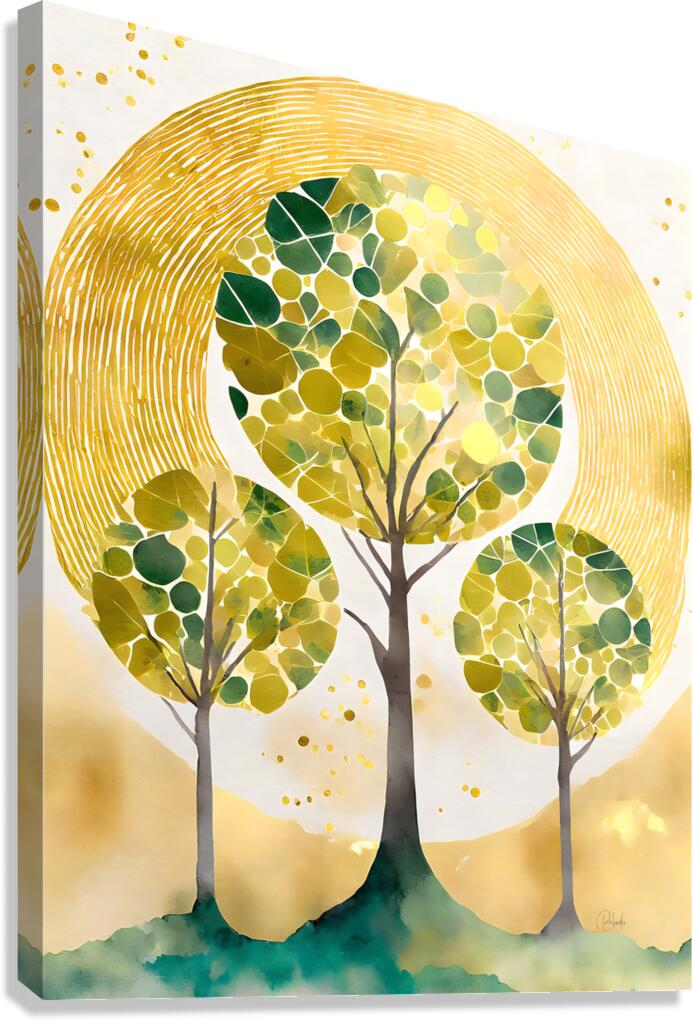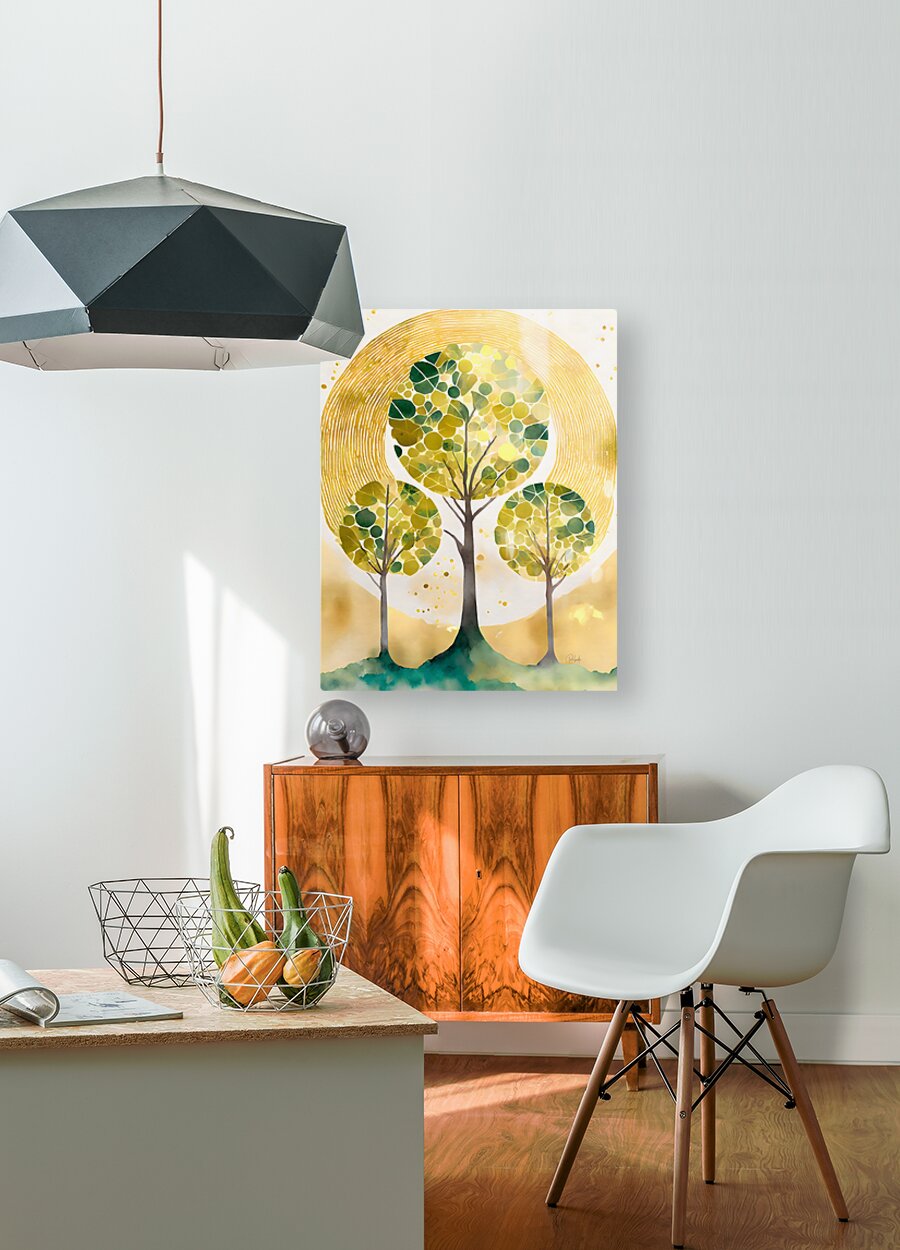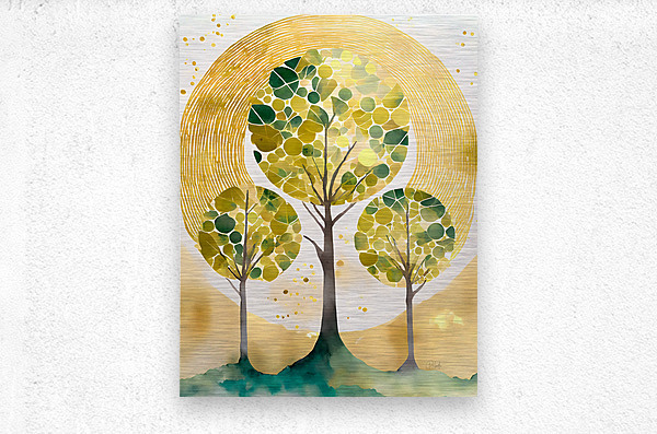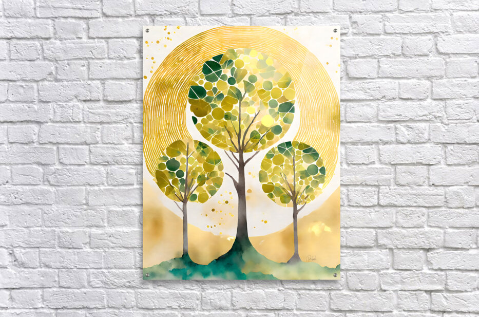 An abstract painting of three trees enveloped by an arch of gold to create a force of nature... one of unity. Perfect for a home or office, select from your favorite media and perfect size. Free shipping to the USA and Canada.