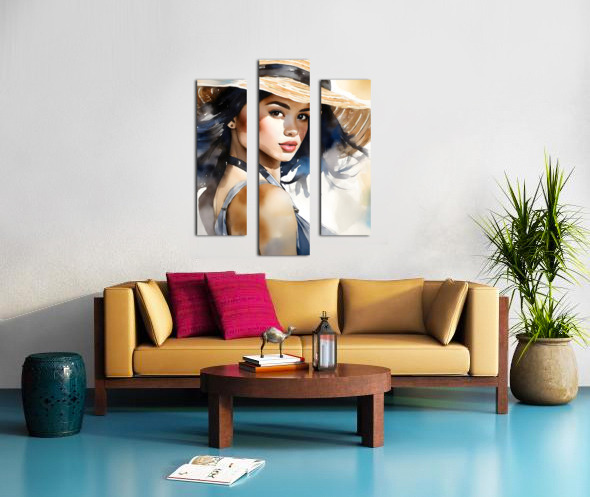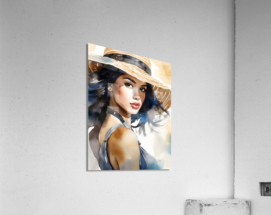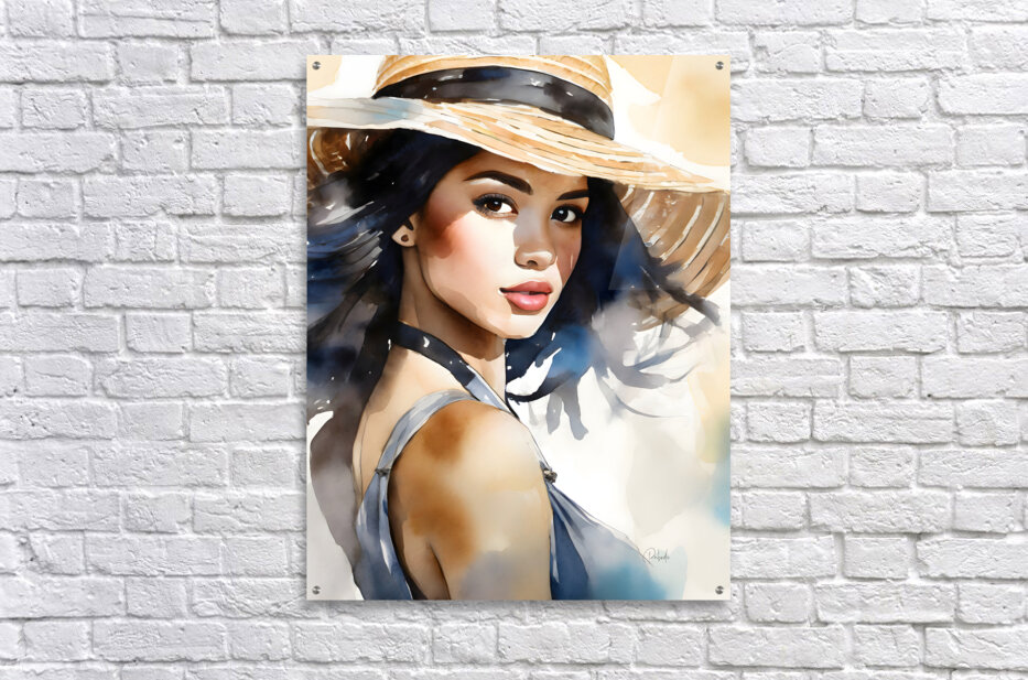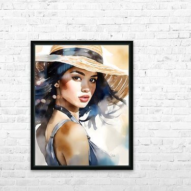 Cherise is looking over her shoulder with a coy expression as she holds her hat on her head in the breezy winds. Her straw hat drapes over her forehead and she gazes straight at the camera with her dark brown eyes. Bring this beautiful watercolor lady into your home or office by selecting your desired media and size to fit that waiting wall. All art ships free to the US and Canada and comes with a 30 day money back guarantee.