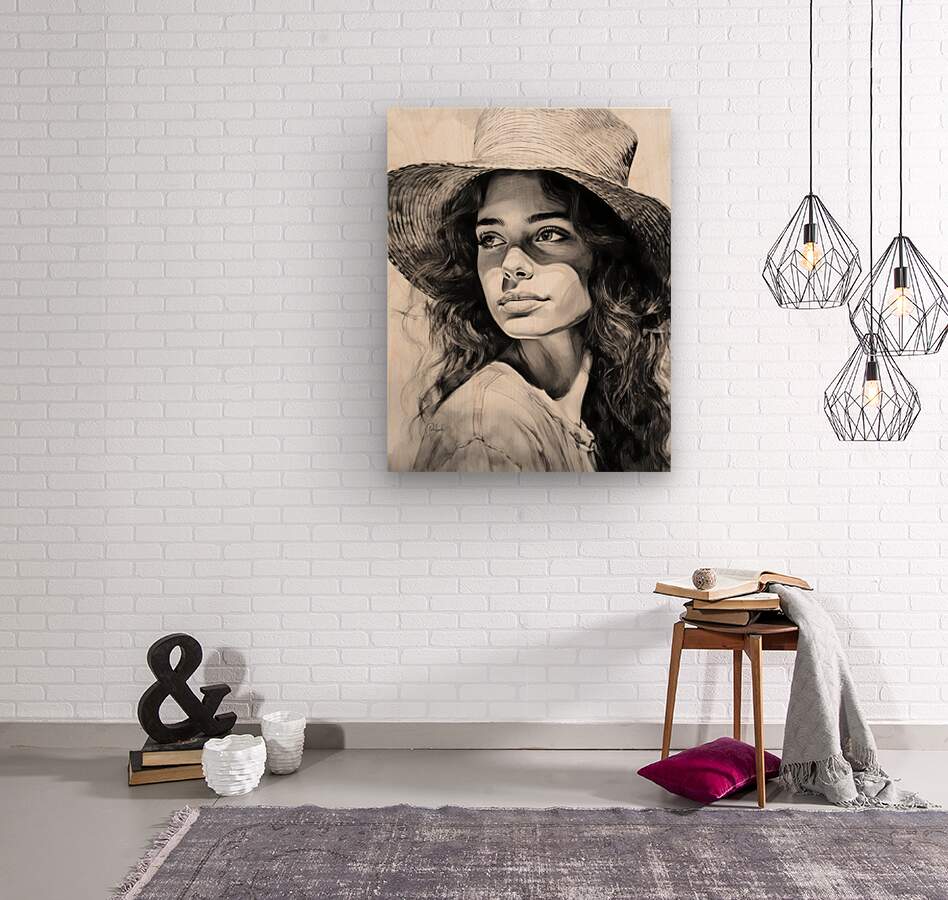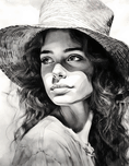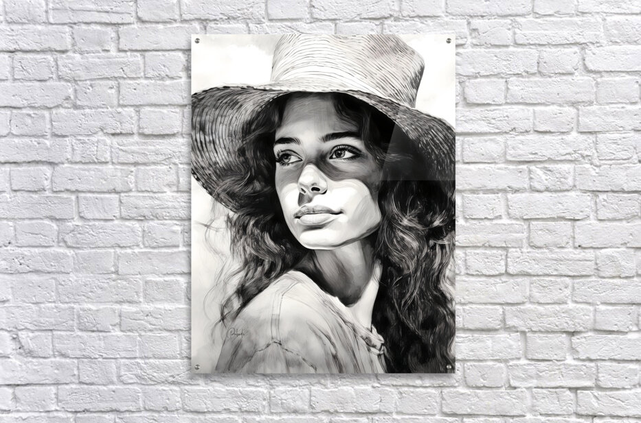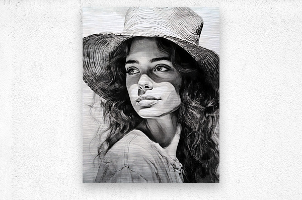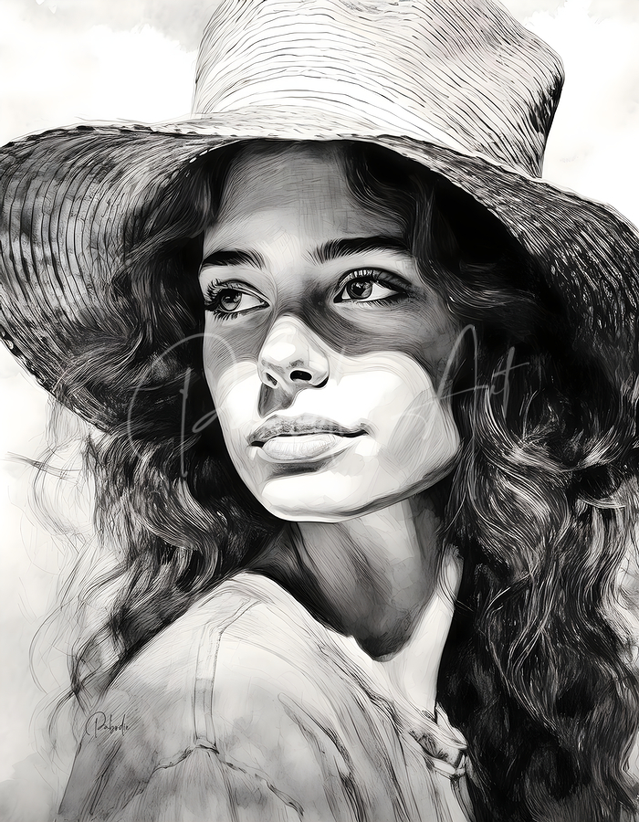 This beautiful woman is casually glancing over her shoulder with a direct stare at someone or something. She is wearing a straw hat that holds her long curly hair against her face and neck. Part of the Faces series this artist print can stand alone or looks terrific alongside one or more of the others in the series. Just choose your size and media.