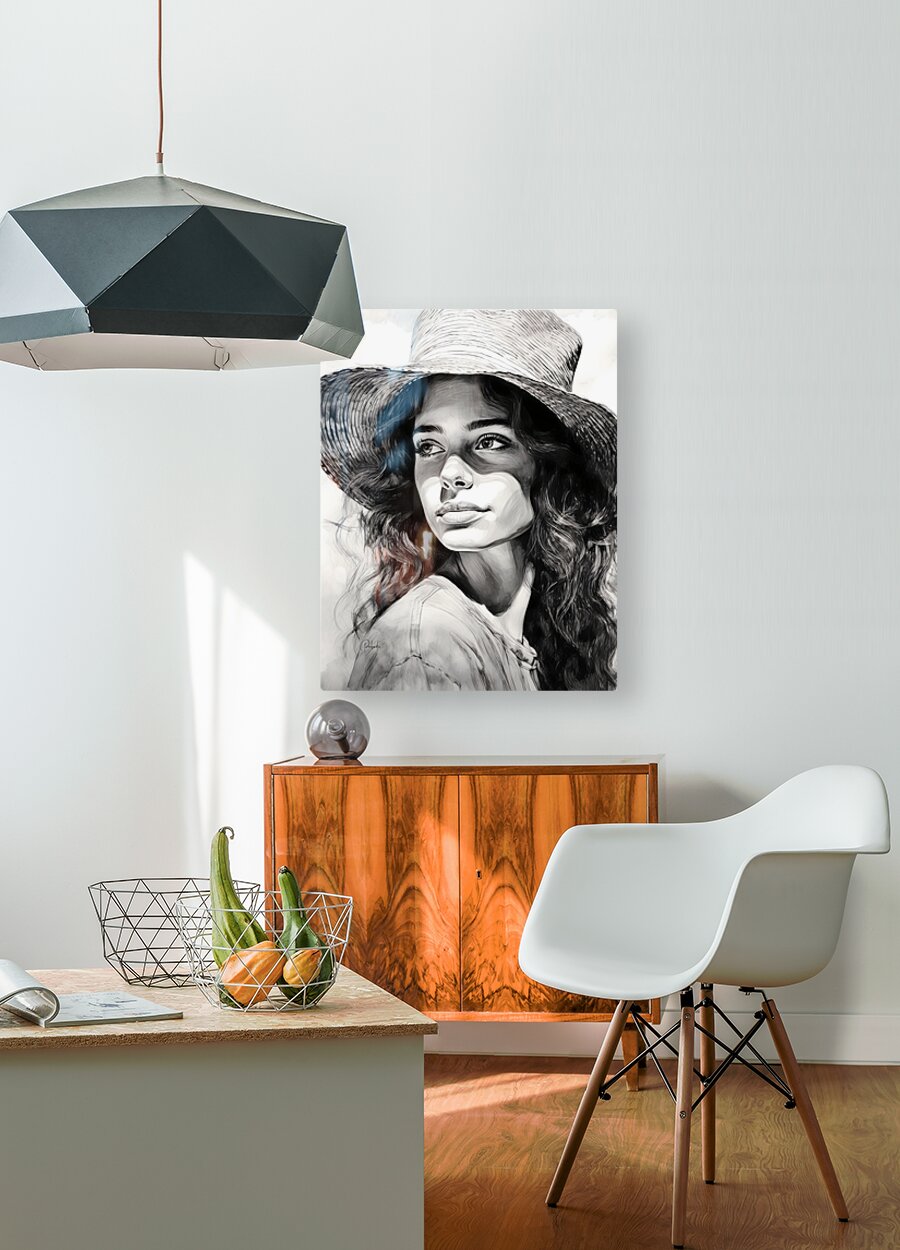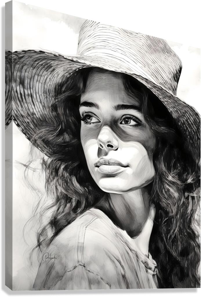 This beautiful woman is casually glancing over her shoulder with a direct stare at someone or something. She is wearing a straw hat that holds her long curly hair against her face and neck. Part of the Faces series this artist print can stand alone or looks terrific alongside one or more of the others in the series. Just choose your size and media.