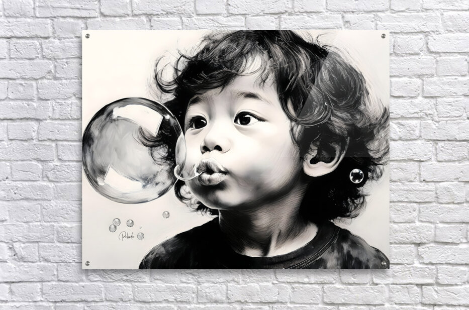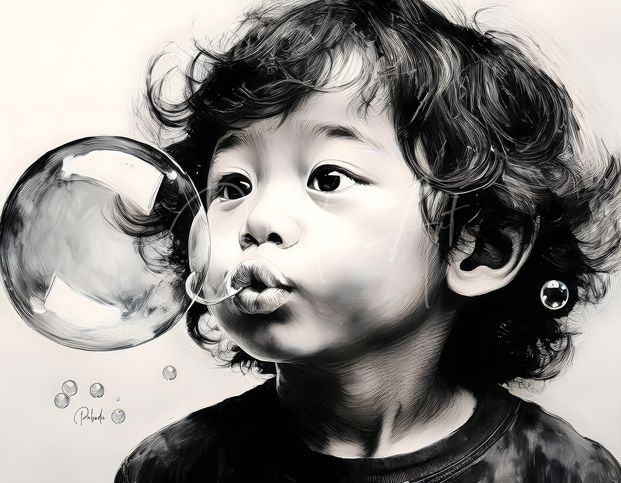 This funny little boy is having a great time blowing bubbles and watching the reflections in them as the float around his sweet face. This artist pri...[+]