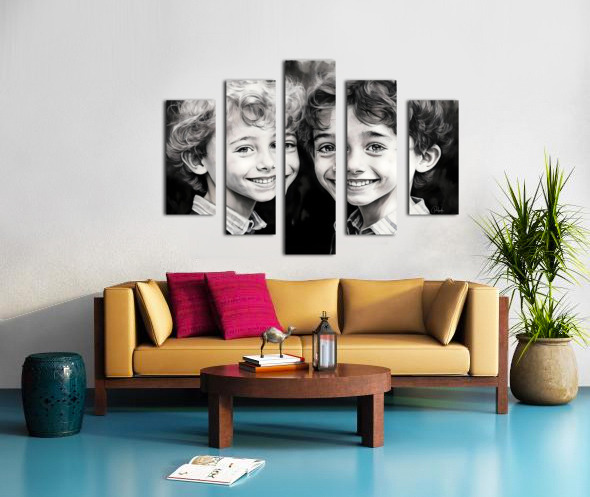 These two boys are brothers and best friends. One dark the other light they are opposites in personalities and appearance but best of friends always. These happy boys look awesome in a home or office and even more dramatic when hung with one or more from the same Faces Collection. Choose your preferred media and size and bring these smiles home today.