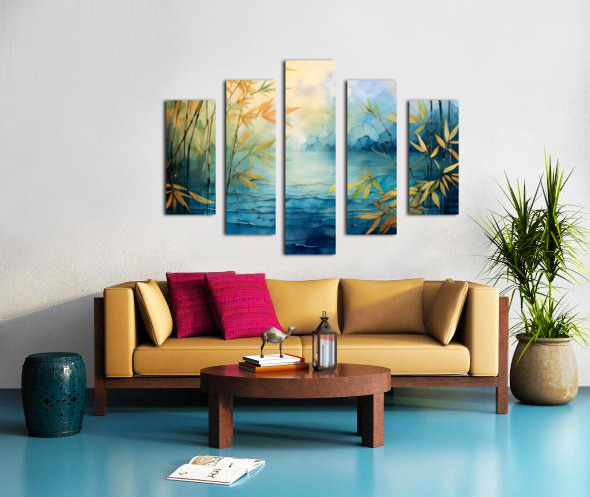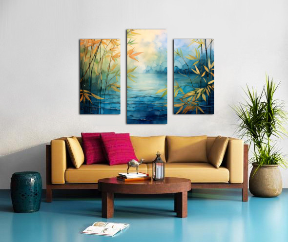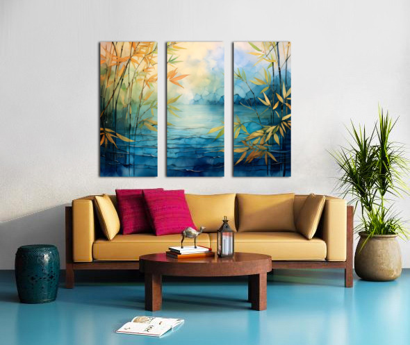 Enjoy these beautiful golds and blues from nature in this abstract landscape of bamboo stems and leaves as they grow above the blue waters. Choose yo...[+]