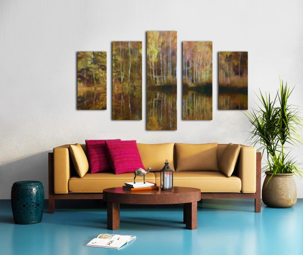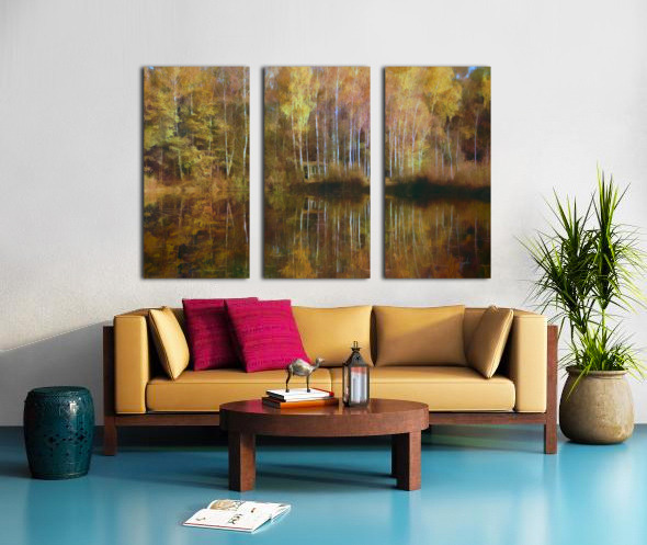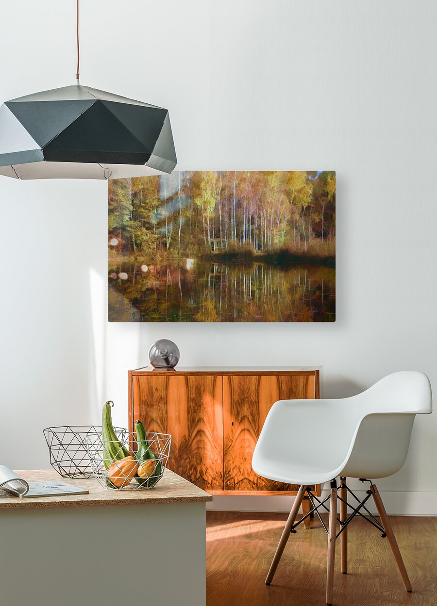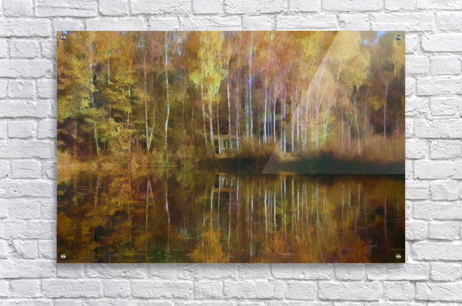 There is nothing like the fall colors and this scene does not disappoint with its tall birches and fall leaves reflecting across and over the lake. A beautiful mix of yellows reds and oranges with a hint of remaining green and, of course, the chalky white bark of the birch trees. Nestled in the middle of all these mirrored colors is a humble fishing cabin. Bring these glorious colors home today and select from your choice of size media and finishes. This wall art will be a cherished part of your family for many years to come.