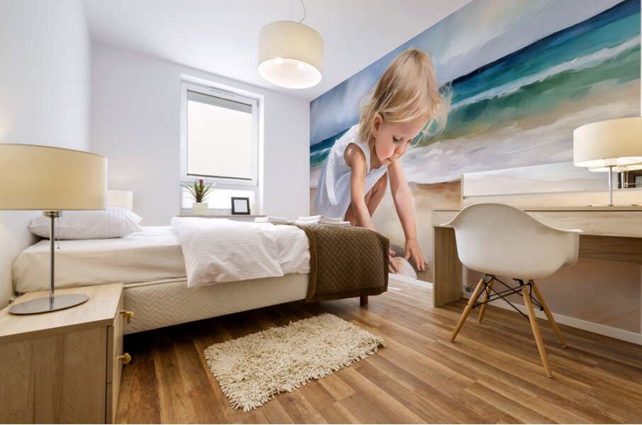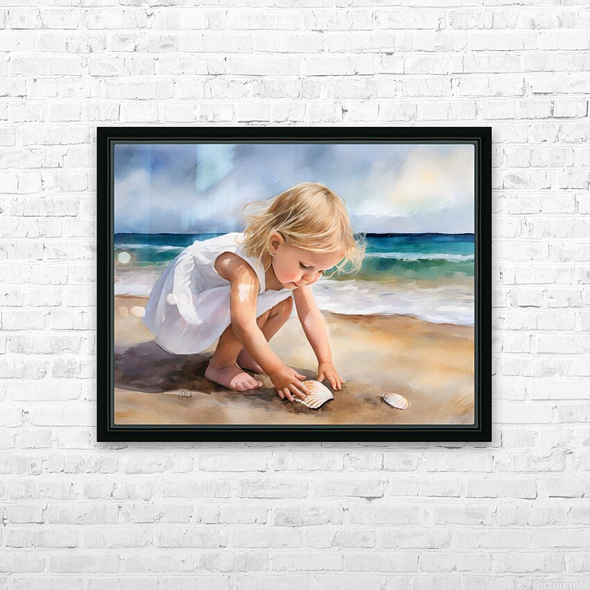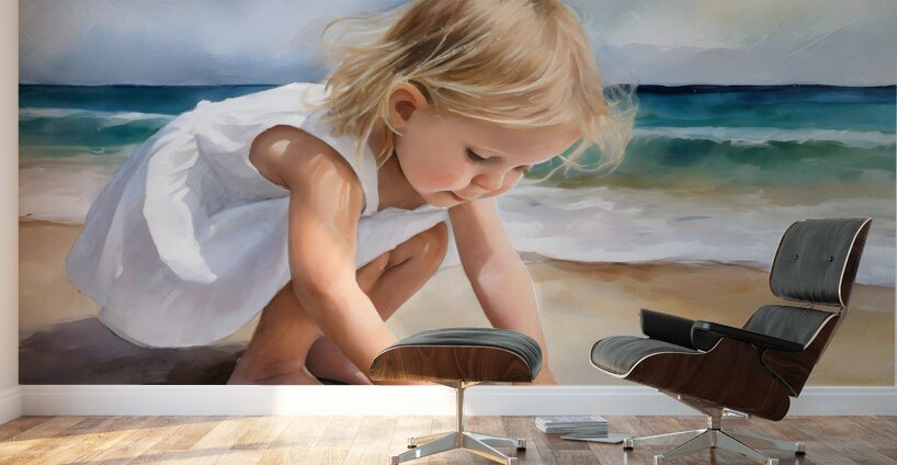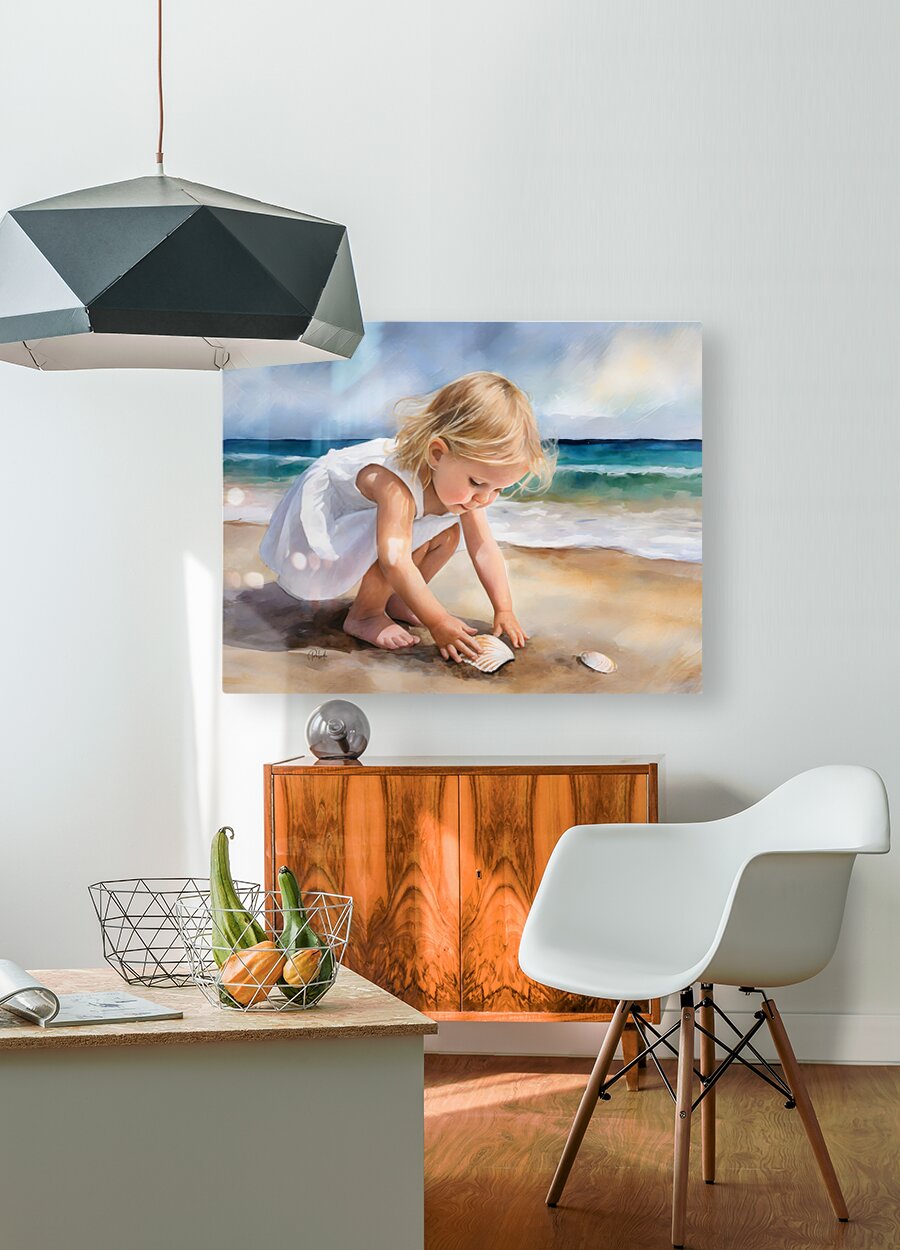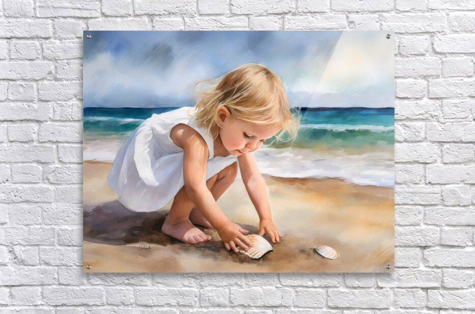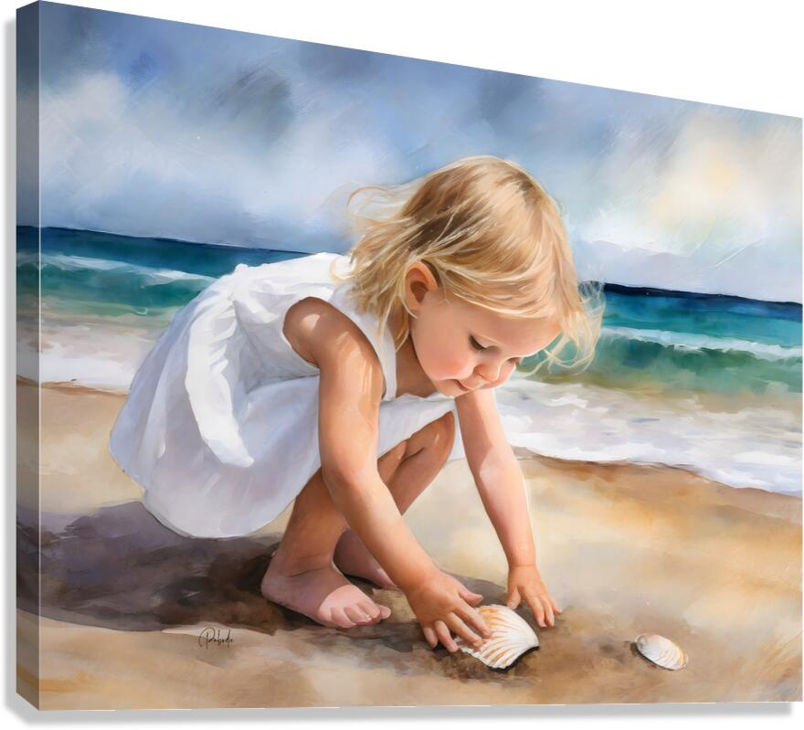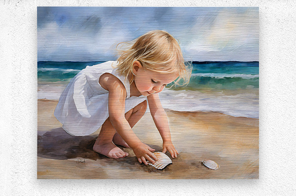 This small toddler is enamored with her discovery on the beach of a scallop shell. She is bending and reaching down to claim it and to make it her own. Take this cute blond haired child home with you and design your wall art in your choice of media size and finishes.