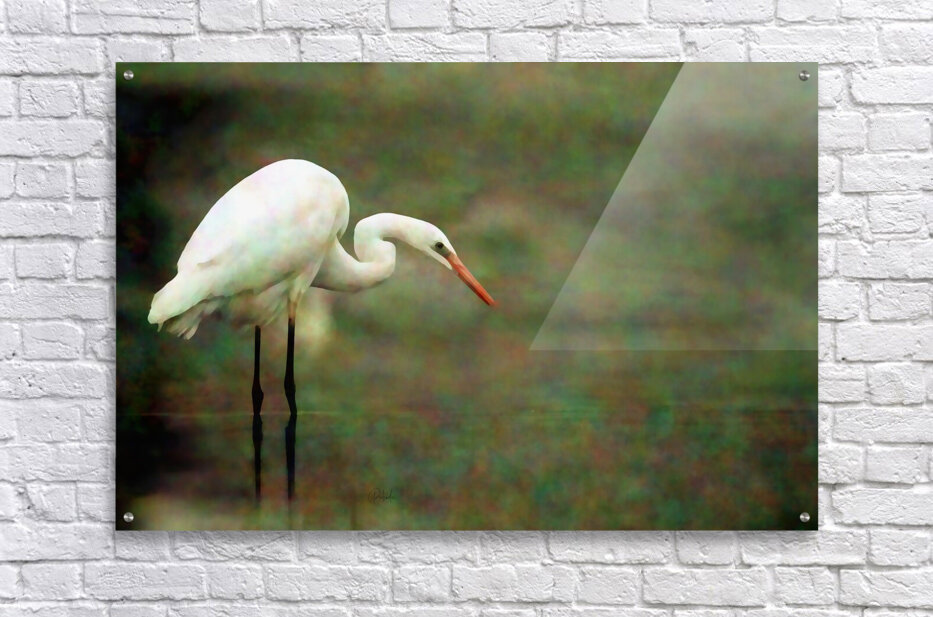 This beautiful digital watercolor depicts the elegant egret who can be found around most bodies of water. Using the greens from the wooded area around the rippled water, he stands with his legs reflecting into the cool waters. This artist print is available in your choice of size and media so you can customize your finished art work to perfectly fit your waiting wall!