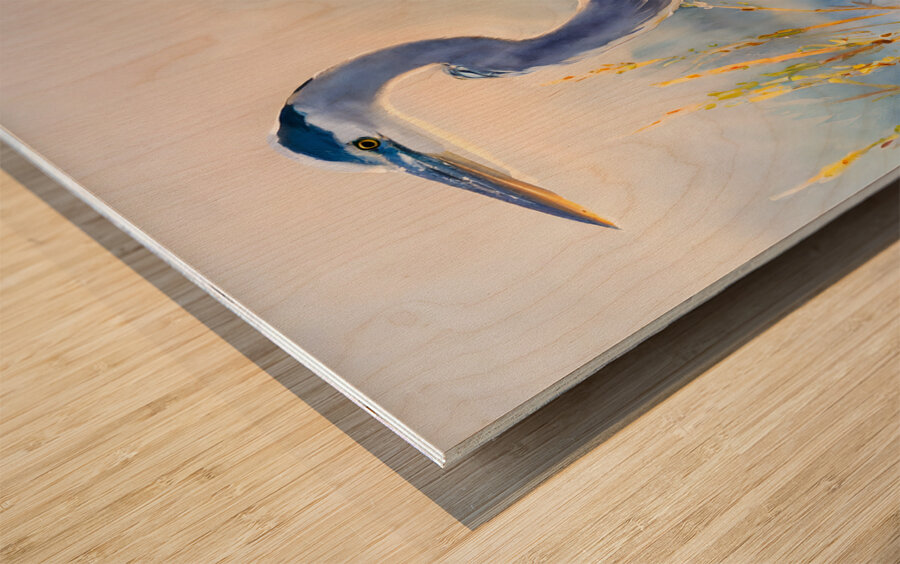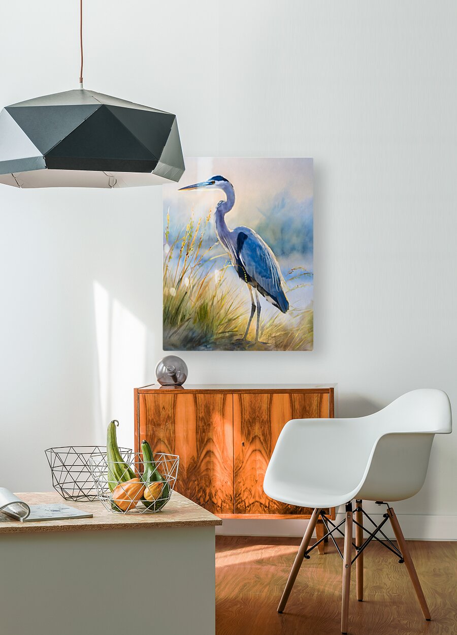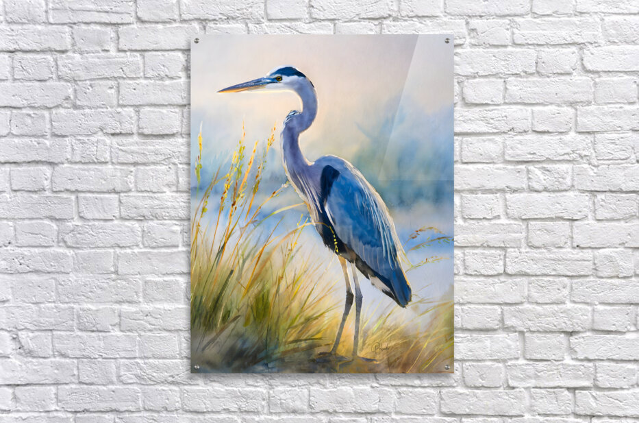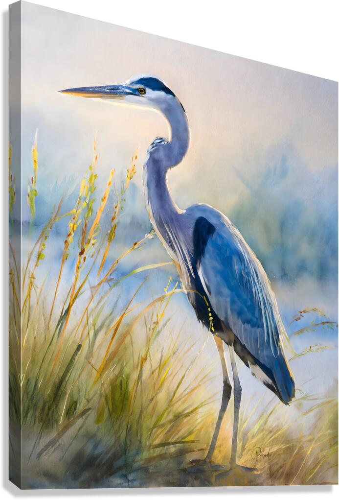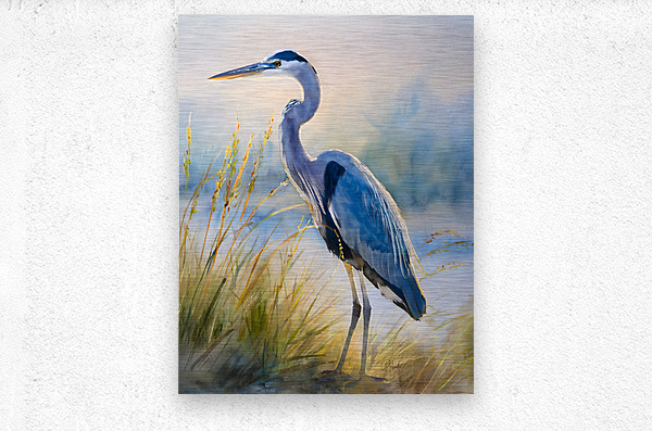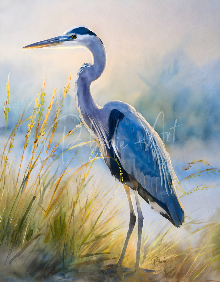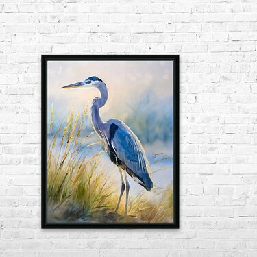 The majestic blue heron stands tall and graceful on the beach as he hunts for his next meal. The beach grass frames his height and the blue of the ocean sets off the blue feathers of this handsome heron. These watercolor artist prints are available in your choice of custom size and in your choice of media. He will look amazing on any wall in your home or office.