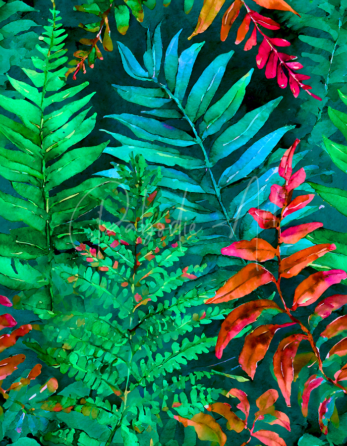 These tropical leaves form creative patterns across the paper in this watercolor rendition. Aquas, reds, orange, and green, combine for a lovely hort...[+]