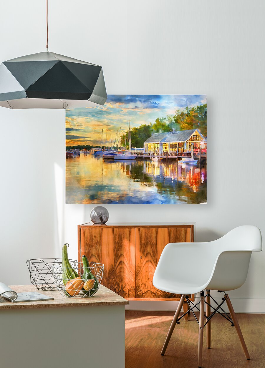Life is lovely along the Vermilion River in Ohio. This scene depicts my memories of the sun coming down and its fantastic colors reflecting onto the river waters, boats, and dockside restaurant. Bring this colorful watercolor, a peaceful and idyllic scene, into your home or office. Just select your preferred size and choice of media.