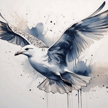 This ink wash captures the ever busy sea gull in flight with his wings spread wide and floating on the draft. This is one in a series of bird ink was...[+]