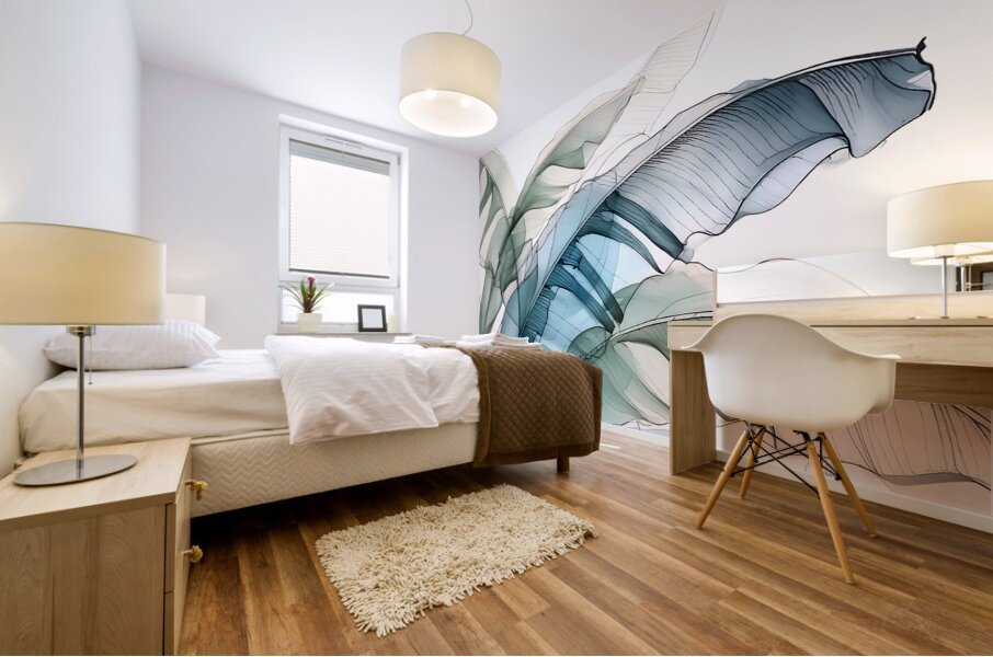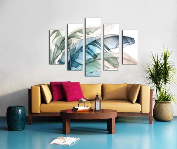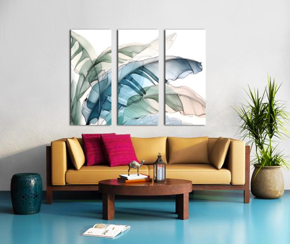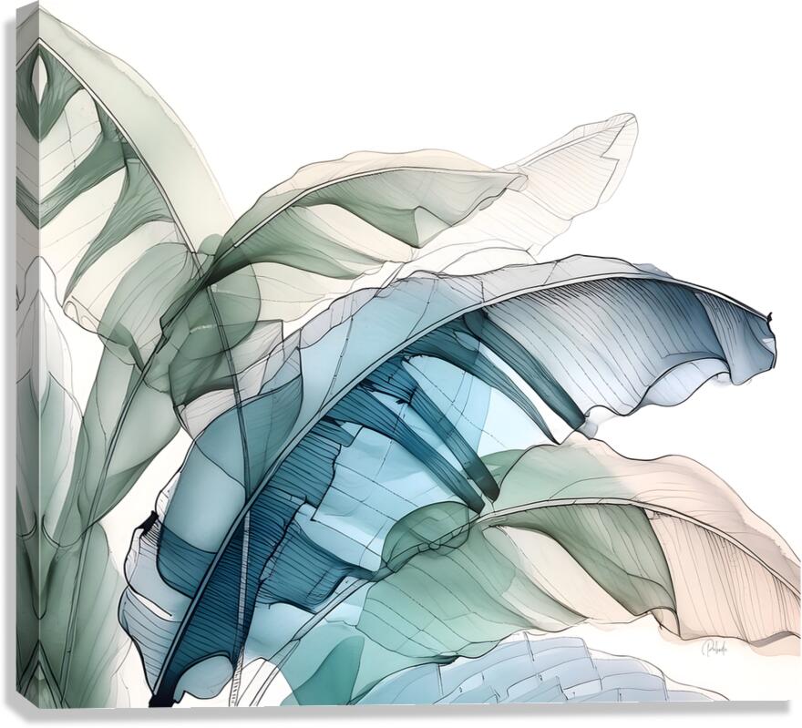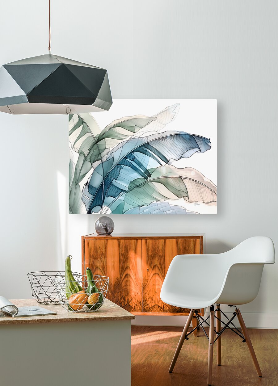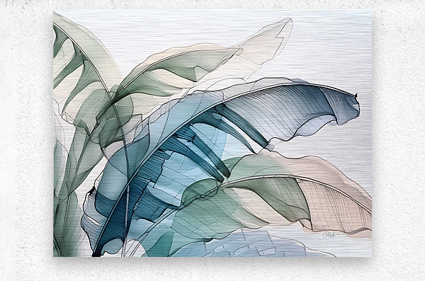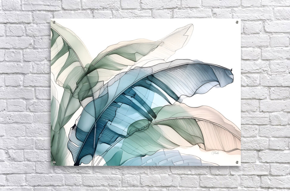 These are beautiful flowing banana leaves in the colors of green, teal, blue, and tan. Their leaves and petals have a transparent appearance with the patterns of their veins producing abstract imagery. Choose your preferred media and sizes and place this wall art in your home or office for a beachy or tropical feel.