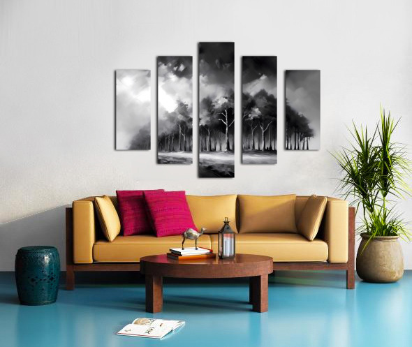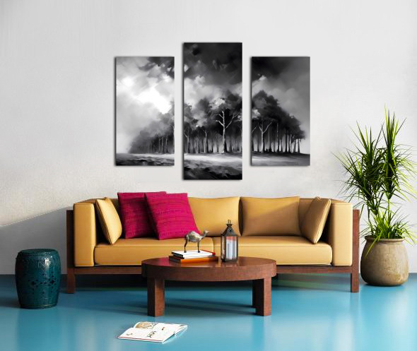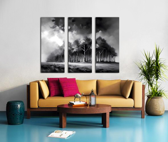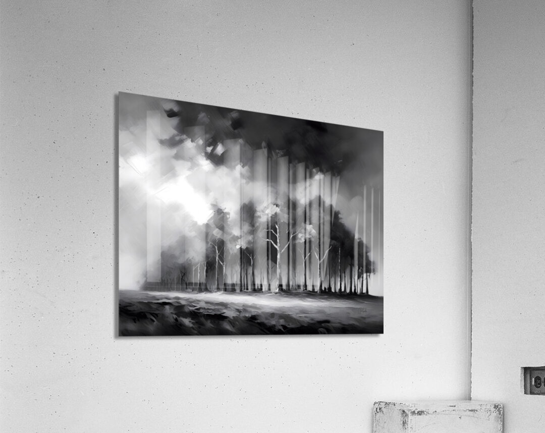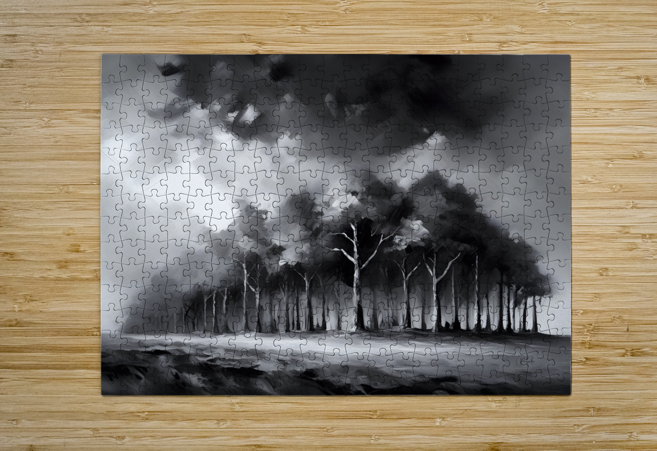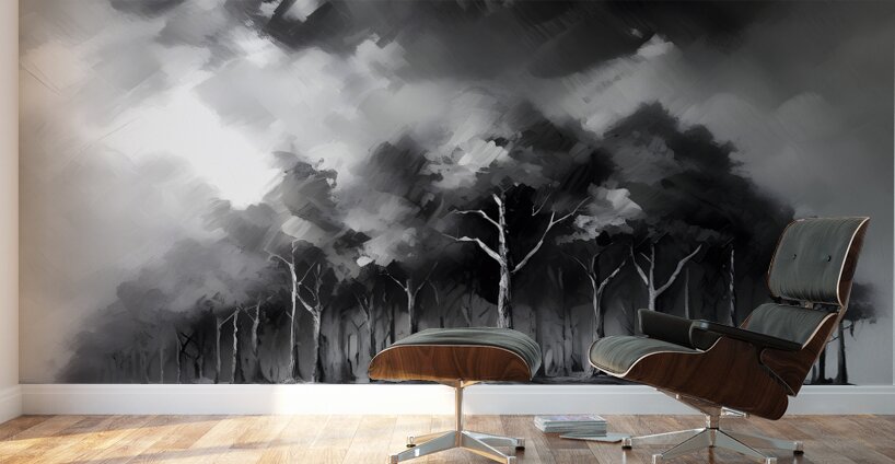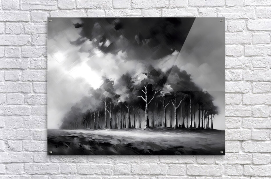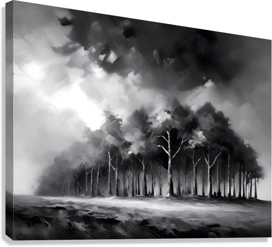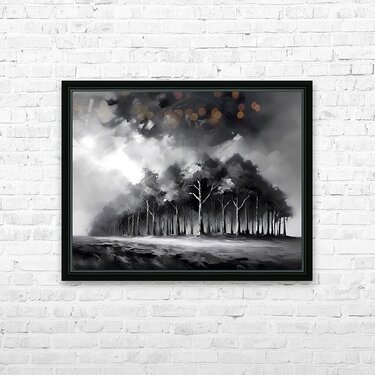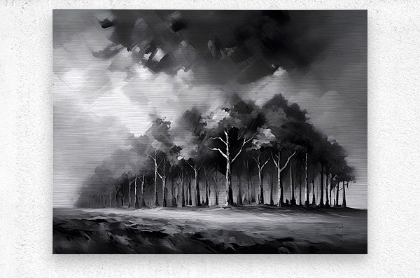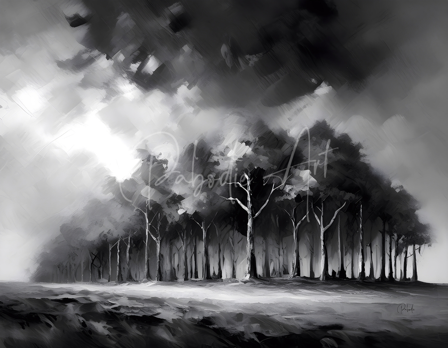 A black and white painting with storm clouds hovering over a copse of trees, this is a moody piece. Hang this Pabodie Artist Print in your home or office and select your choice of media and size for that waiting wall.
