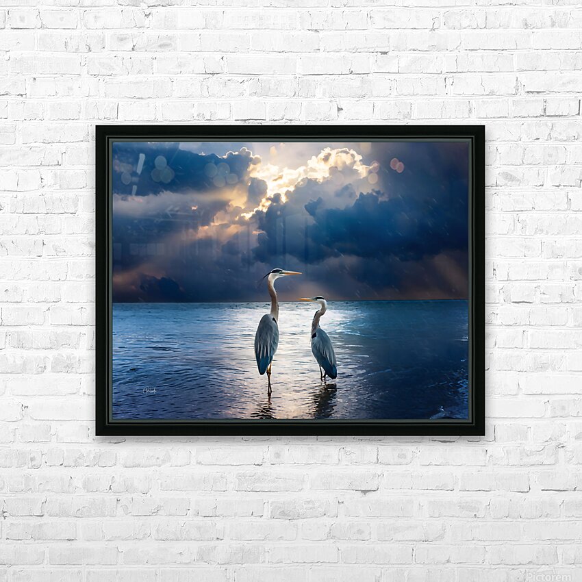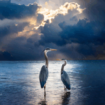 The sun is rising and breaking through the dark clouds as it shines its light onto two Blue Herons perched at the waters edge. This lovely painting is available as an artist print onto your choice of media and size. Fill that empty wall and enjoy a bit of the beach in your home or office. All art ships free to the US and Canada and comes with a 30 day money back guarantee.