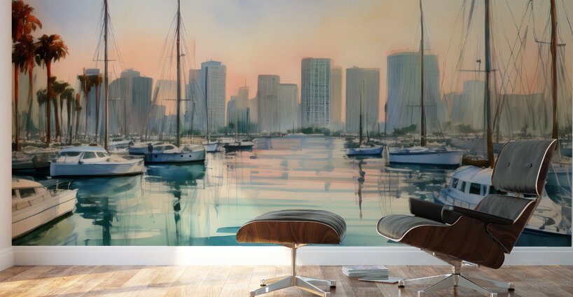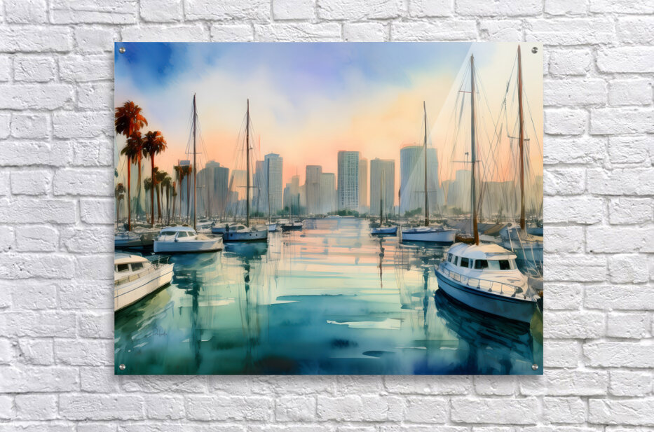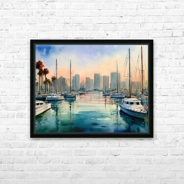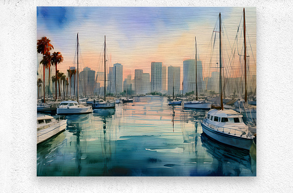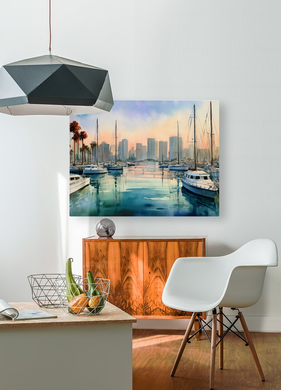 The view from the Bay marina back to the skyline of San Diego shows a beautiful blend of land and sea with a calming mood only the water can create. Bring this bit of Pabodie Art into your home or office today. Just select your preference of media and size along with any special finishes and your art ships free to those in the US and Canada. All art comes with a 30 day money back guarantee.