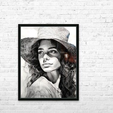 This beautiful woman is casually glancing over her shoulder with a direct stare at someone or something. She is wearing a straw hat that holds her long curly hair against her face and neck. Part of the Faces series this artist print can stand alone or looks terrific alongside one or more of the others in the series. Just choose your size and media.