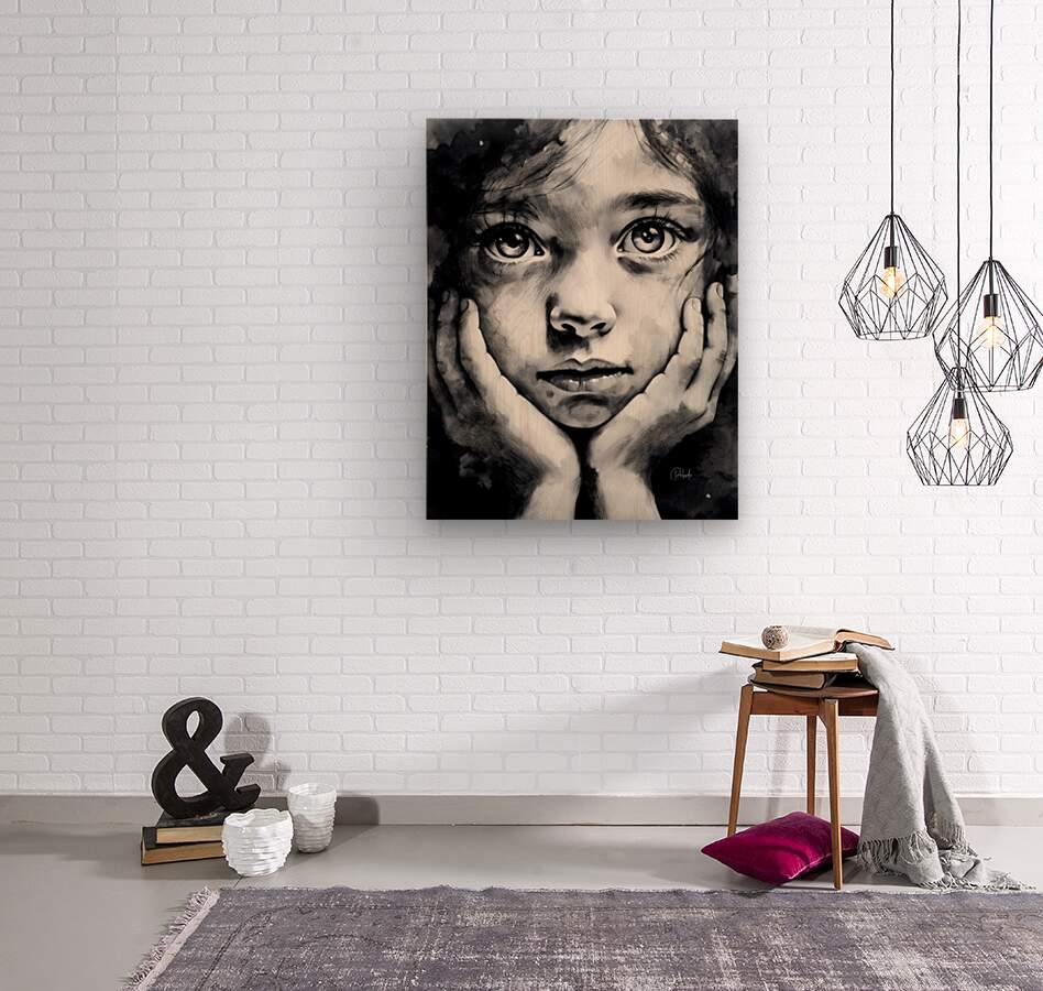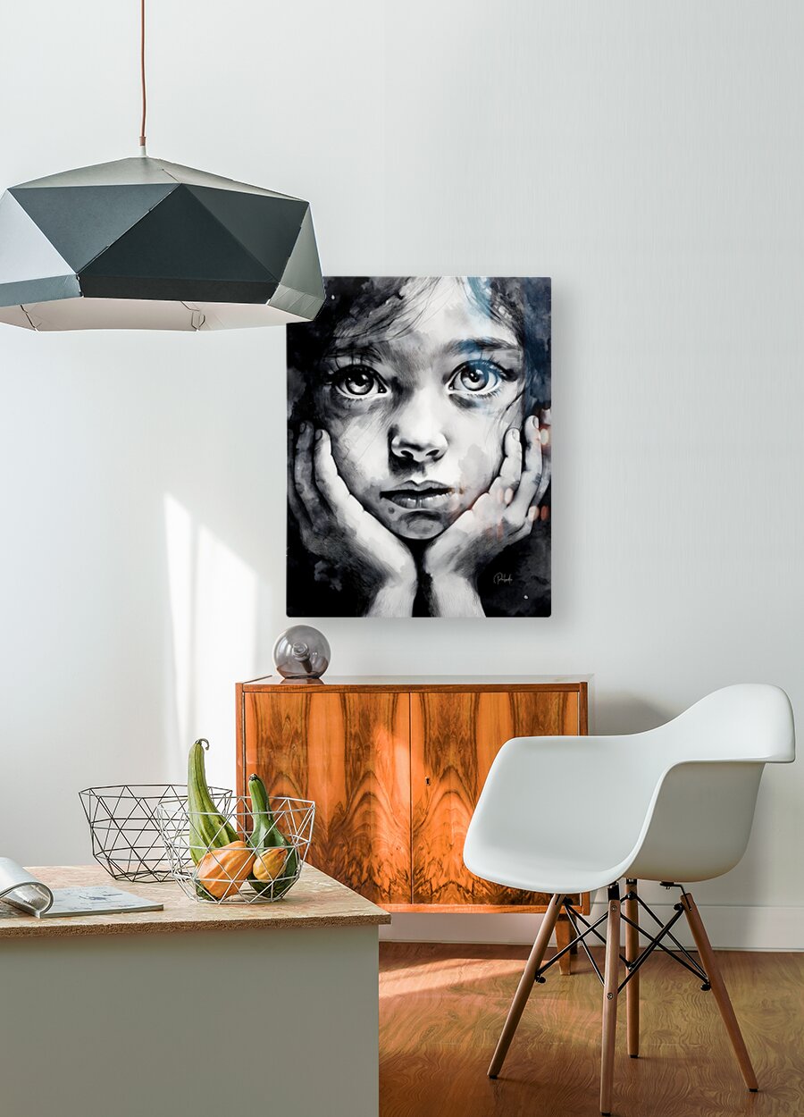 Like a puppydog those seet eyes continue to stare at you as she is patiently waiting for you to finish up. Her hands cup her face and those long lashes accent those beautiful round eyes. Hang her alone or better yet with one or more from the Faces Collection to create an amazing wall of artist prints. Choose from many media and sizes to fit your waiting wall.