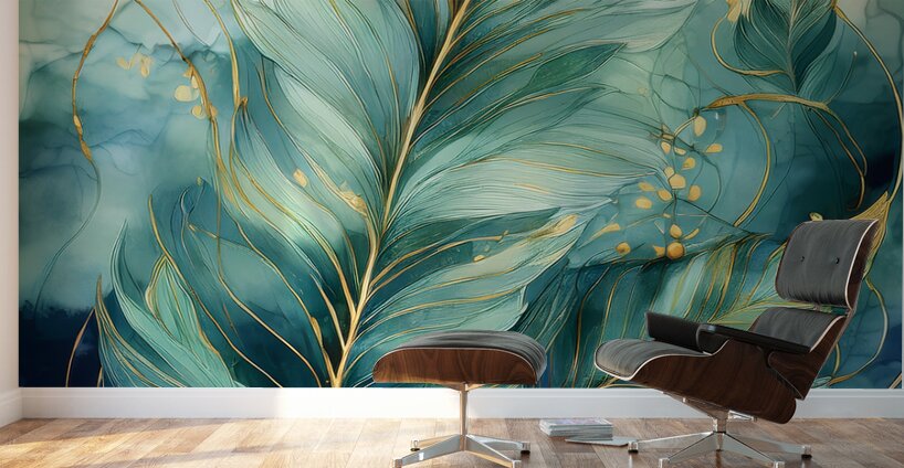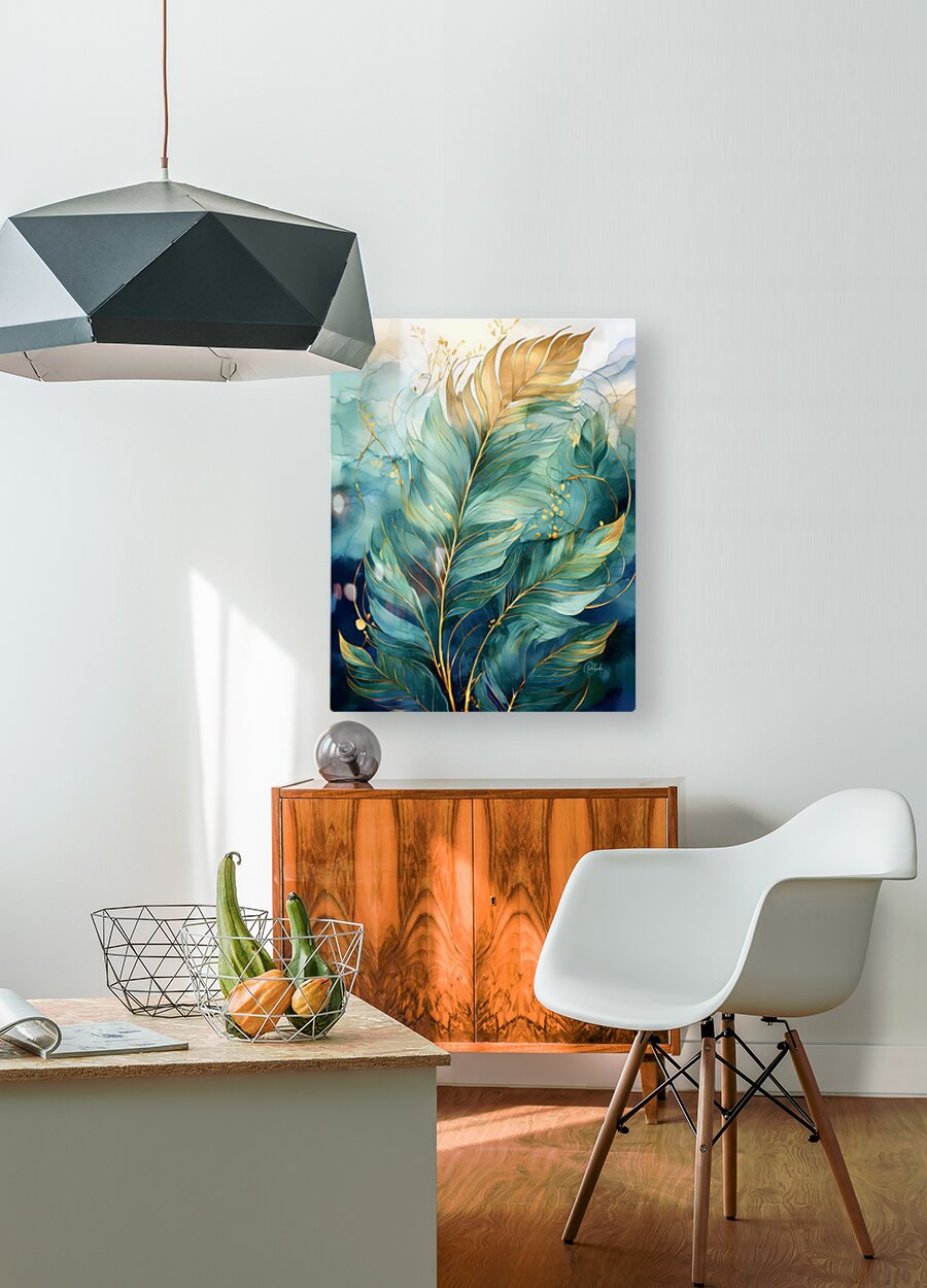 You can feel the breeze through these stylized palm leaves as they bend and go with the flow. They are touched with flecks of gold to highlight their green leaves, veins, and stems. This abstract plant art would look lovely in any home or office. Choose your size and desired media and bring this art home today.