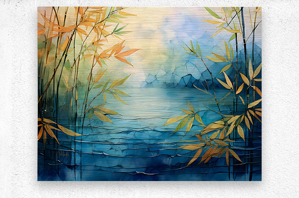 Enjoy these beautiful golds and blues from nature in this abstract landscape of bamboo stems and leaves as they grow above the blue waters. Choose yo...[+]