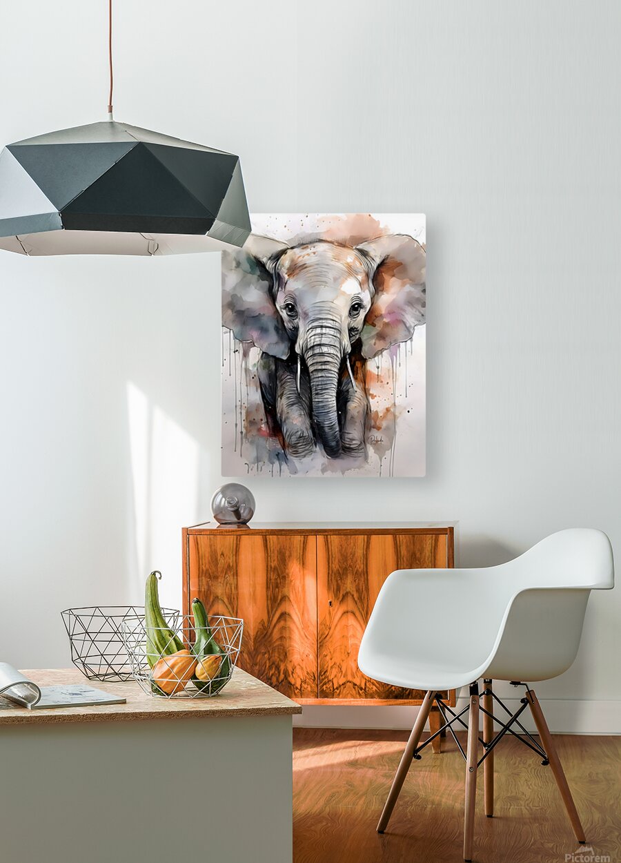 This sweet baby elephant has a whimsical look done with watercolor and ink. His eyes and trunk frame his husks and his ears are expressive and decla...[+]