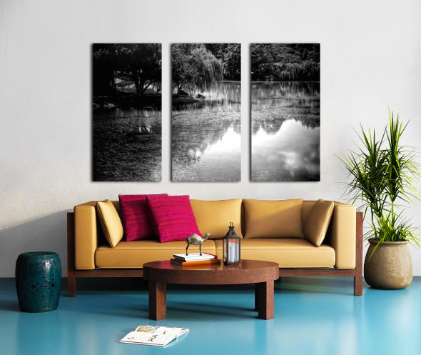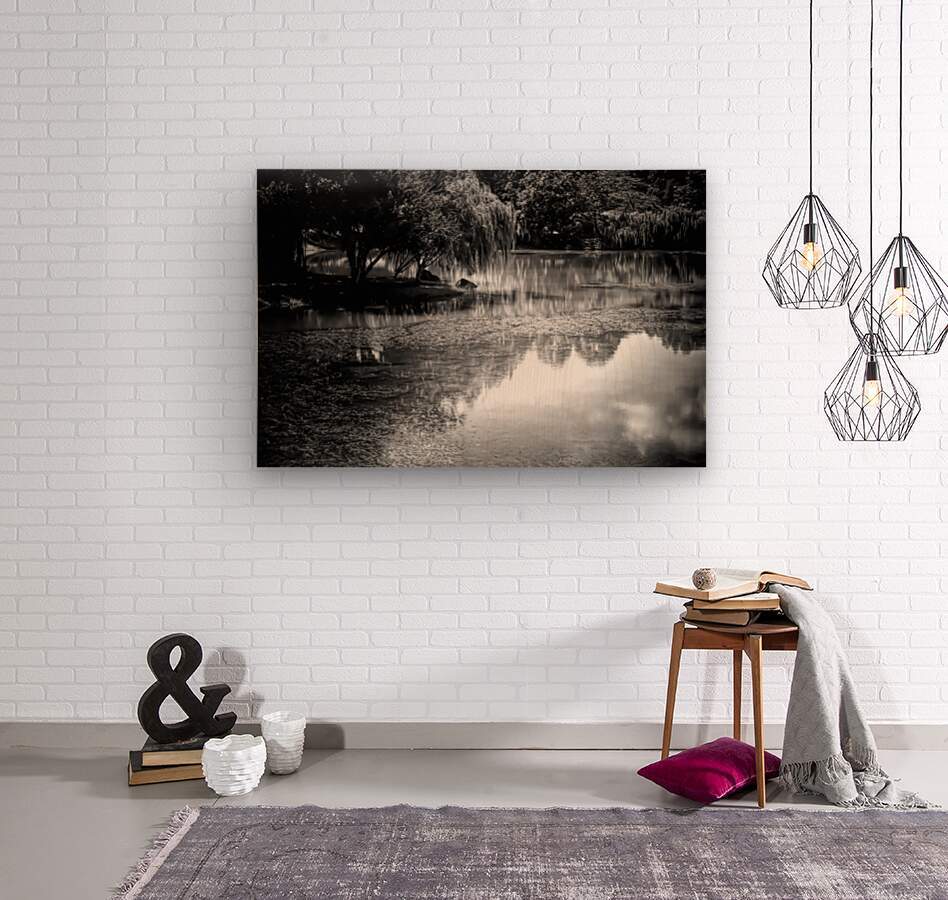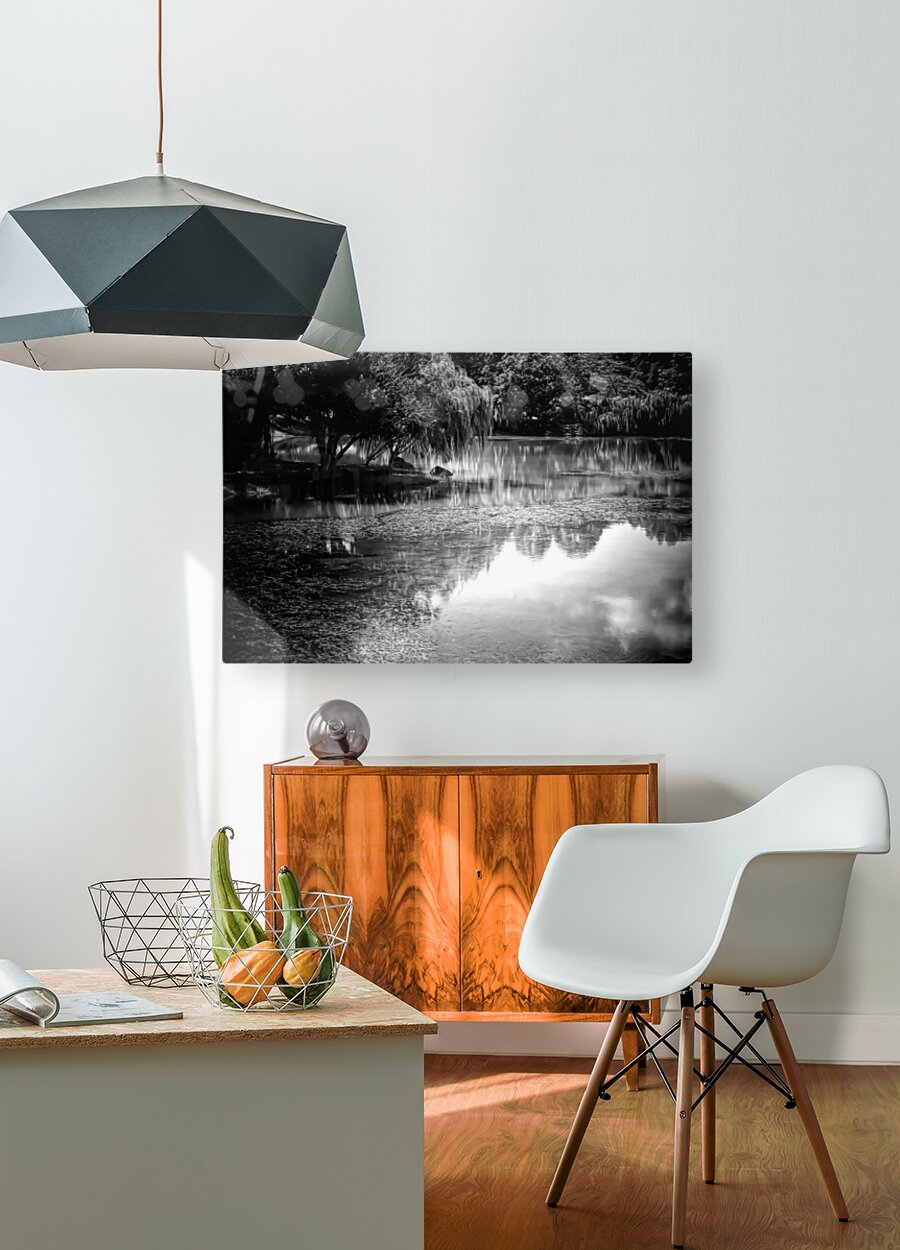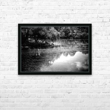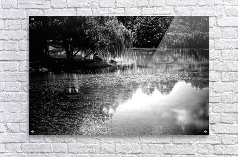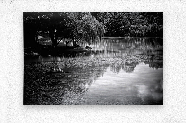 This peaceful scene of willow trees bending over the still waters creates perfect glassy reflections that are mirrored into the waters. Bring this idylic black and white landscape into your home or office today in your choice of media. This Pabodie artist print can be printed onto canvas metal acrylic wood framed and matted and museum quality papers. Greeting cards with your personal message are also available.