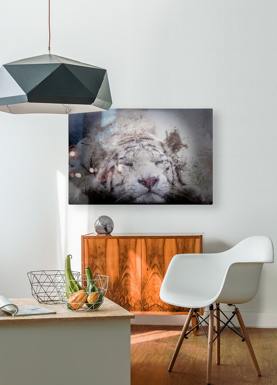 This rare white tiger is sleeping but if he was awake you would see his startling blue eyes. White tigers are a rare mutation of the Bengal tiger and are not albino. There are only about 200 left in the world today, all in zoos or theme parks or private collections. It is believed there are no longer any left in the wild. This amazing white tiger can be displayed in your home on canvas, wood, metal, acrylic, framed, or on museum quality paper. Choose your size and media and bring home this Pabodie Artist print today.