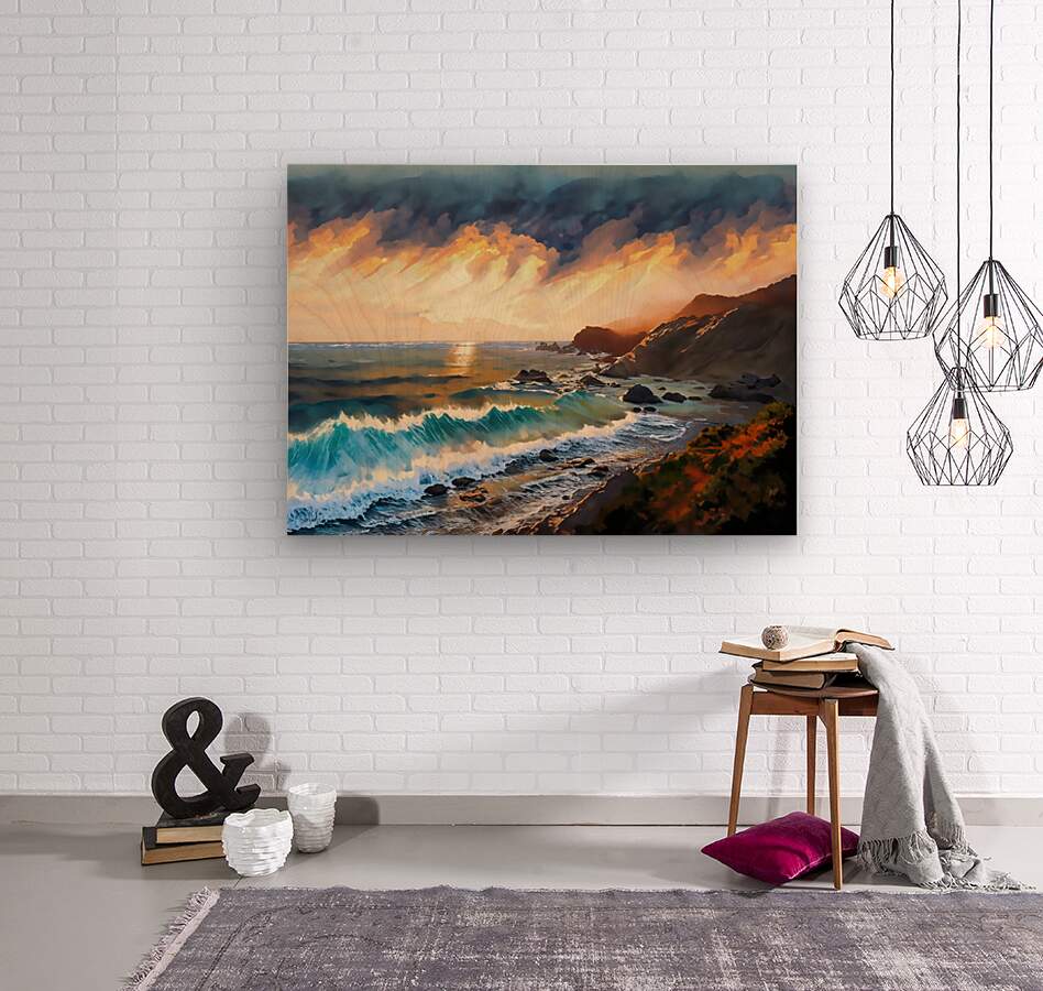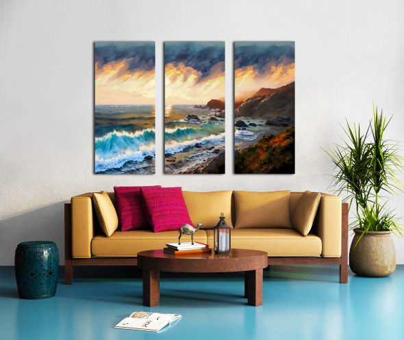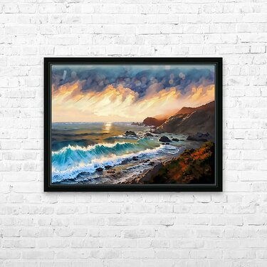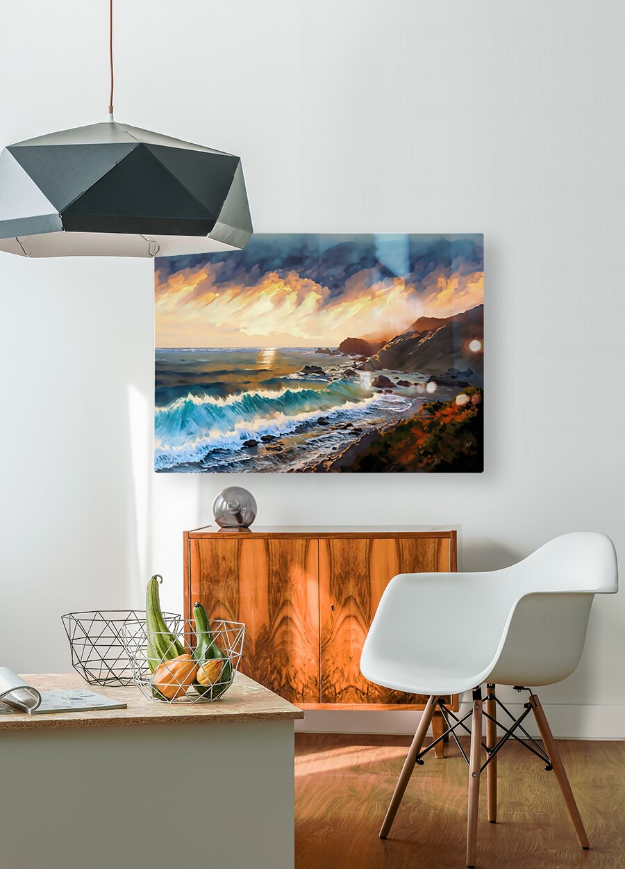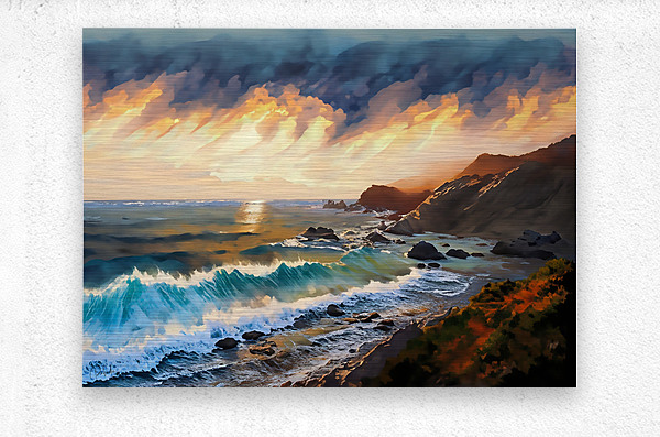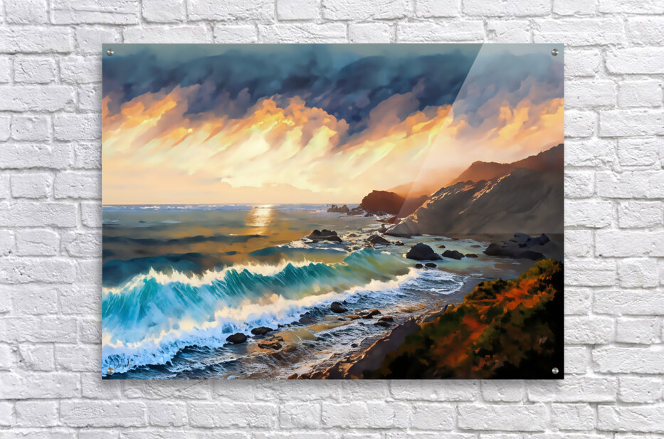This watercolor shows the Big Sur coastline in all it majesty with its rocky shoreline pounding pacific waves and clouds of color. The sun is rising illuminating the shoreline with its beautiful colors. This artist print is available in many choices of media and finishes. Choose the size that best suits your preference to display this wall art.
