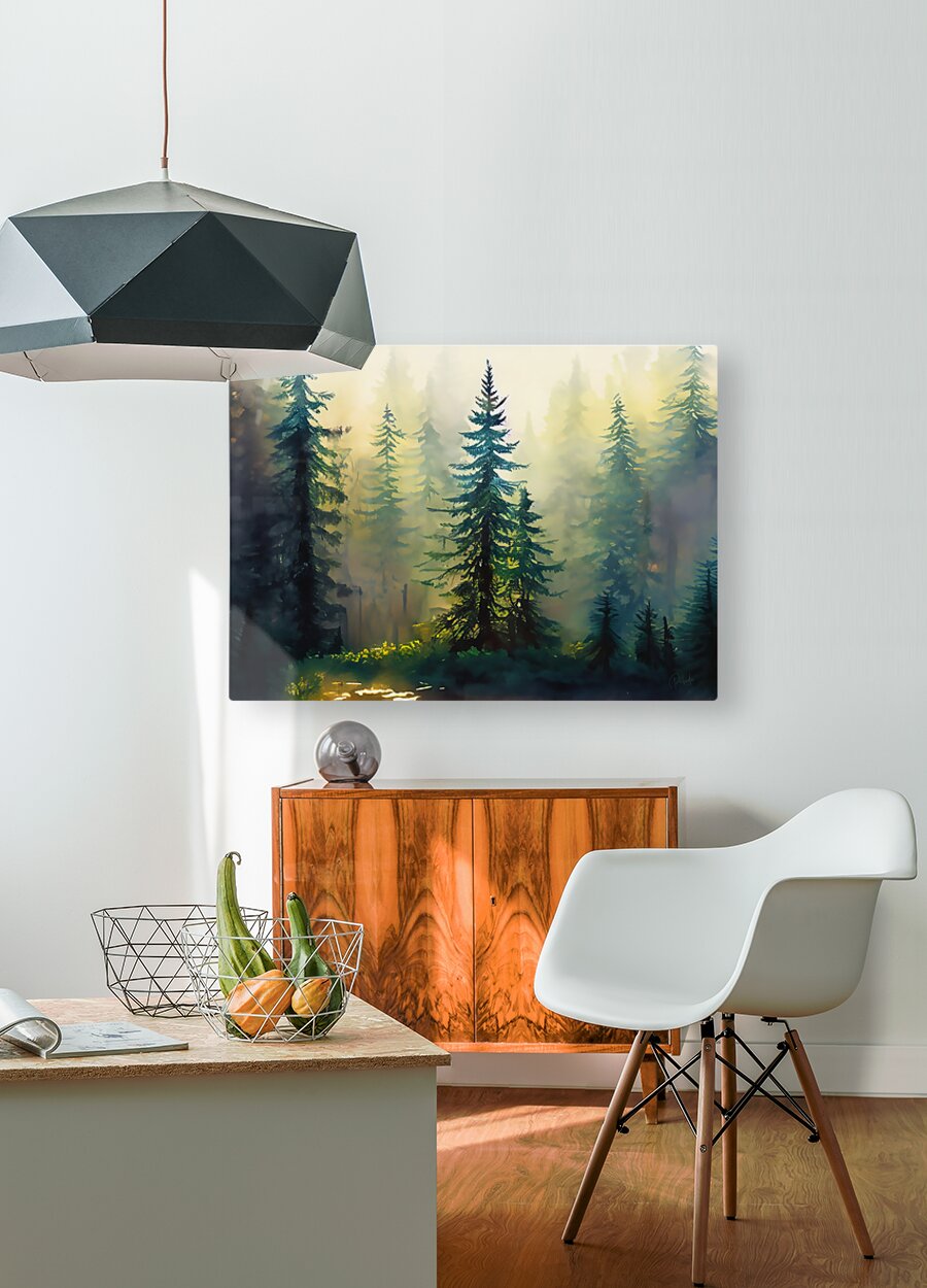 This is a watercolor print of tall fir trees in a forest with morning sunlight filtering down thgough and into the trees. This peaceful scene is both calming and refreshing and will sooth whatever ails you! Available in your choice of size, select your desired media and finishes and bring this lovely Pabodie Artist Print into your home or office.