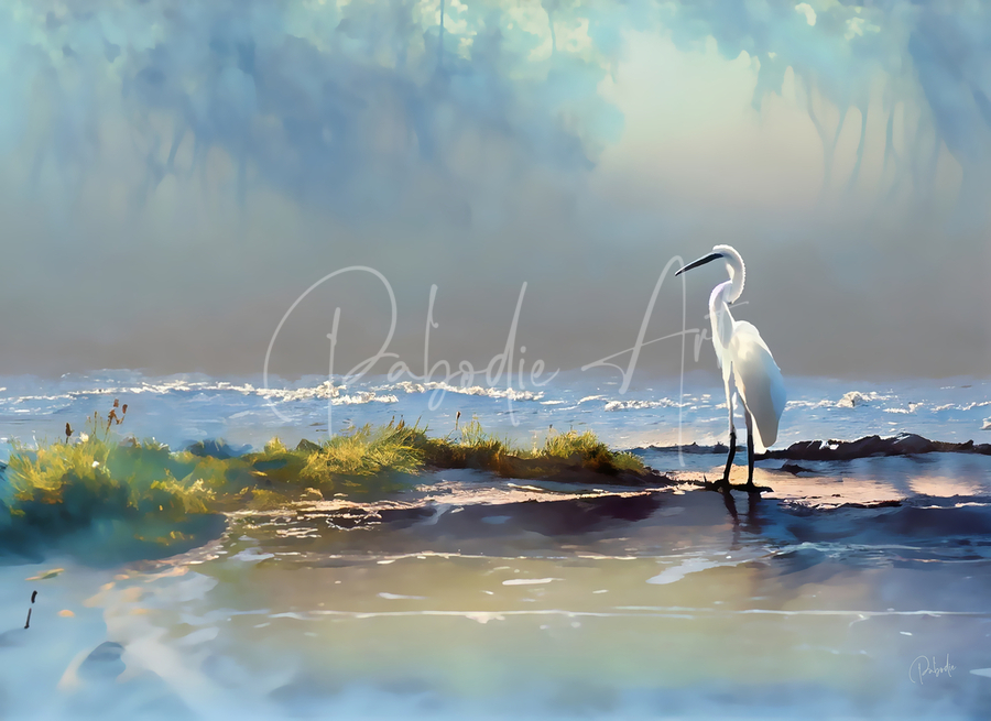 This elegant Egret was at his favorite tidal pool looking for his next meal when the skies above him opened up with an early morning summer shower. Allow this beautiful Pabodie Artist Print to grace a wall in your home or office. Available in your choice of media including canvas, metal, acrylic, framed and matted. and as museum quality prints. Choose your media, size, and finishes and enjoy this quality art for many generations to come.