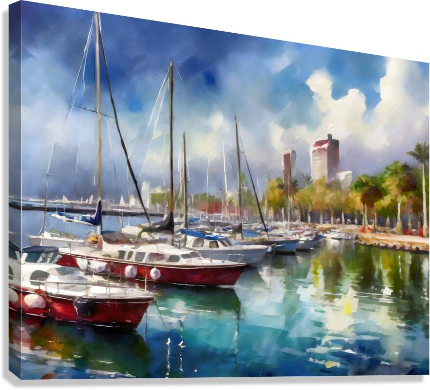 Its a blue skies and blue waters day in sunny Marina Del Rey California. Power and sail boats are moored and bobbing their reflections into the beautiful protected waters of the bay. Choose your desired size and media and enjoy this quality produced artist print in your home or office for generations to come.