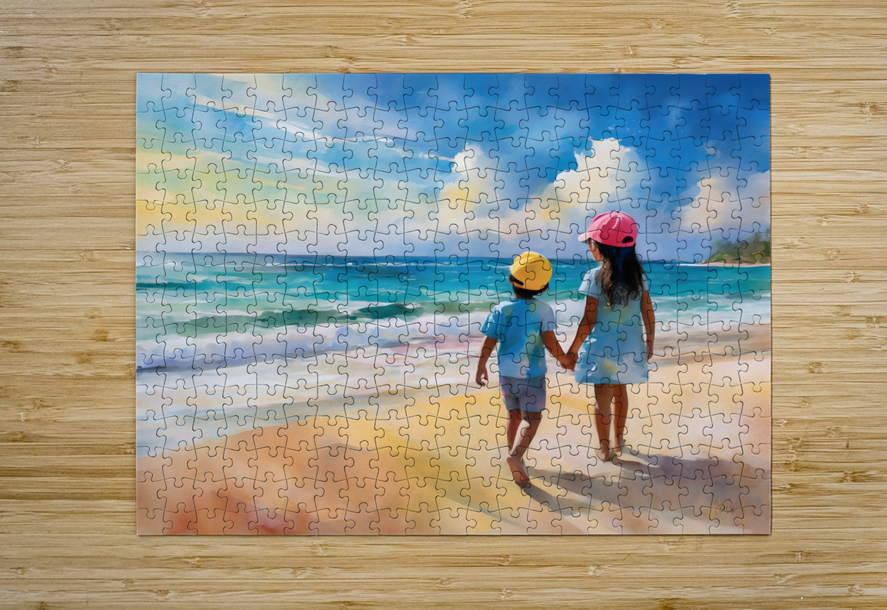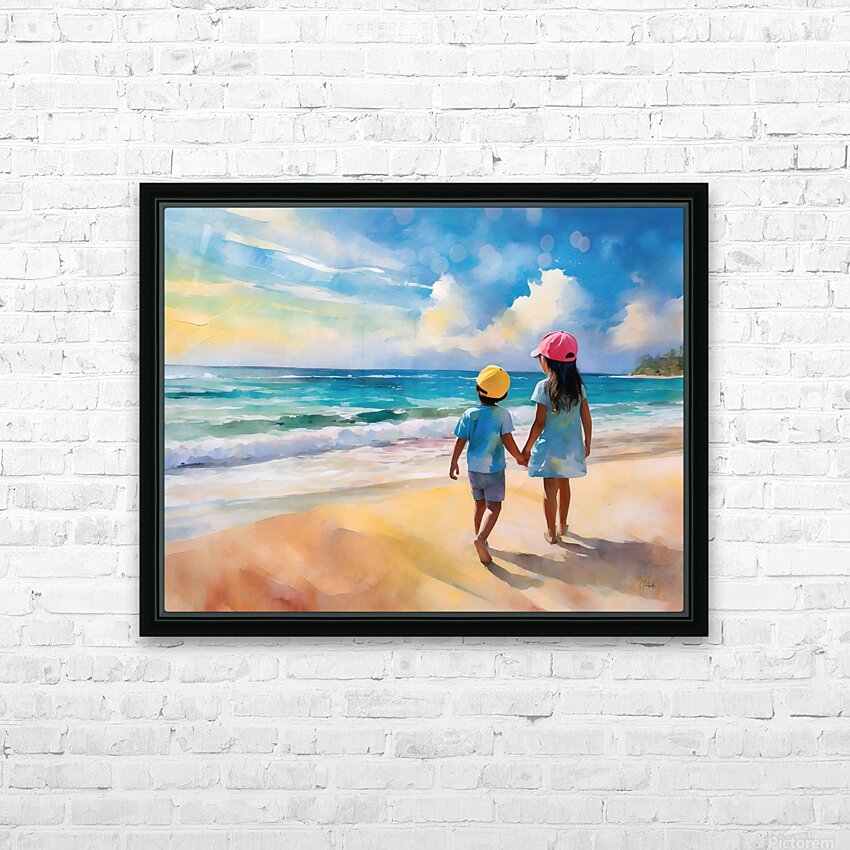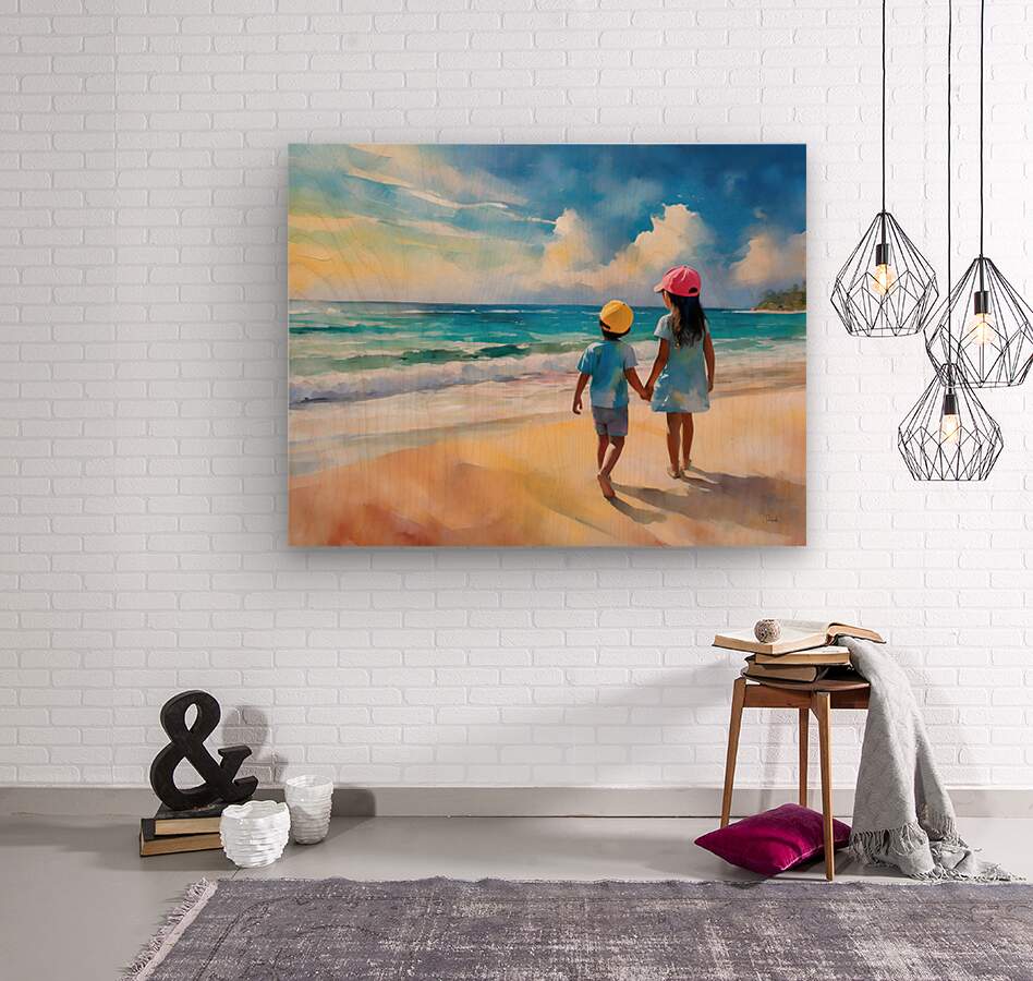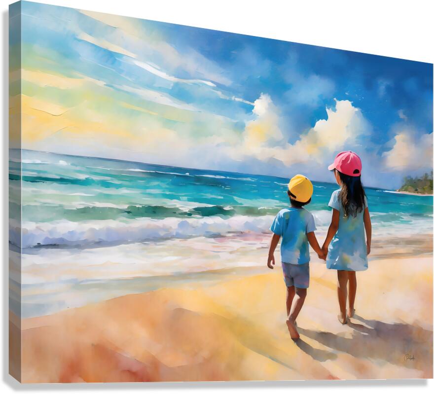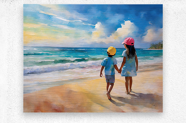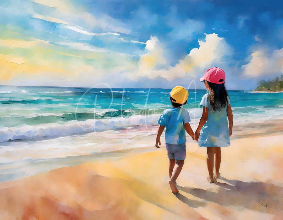 This summery watercolor shows a big sister holding her brothers hand and talking to him as they look out over the ocean. There is nothing like the teachings of our siblings and the bond of closeness and trust. This Pabodie Artist Print can be ordered in your choice of media and finishes. Just choose the size for your wall art to hang and you will enjoy this piece of art for generations to come.
