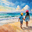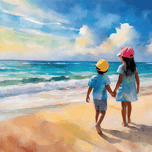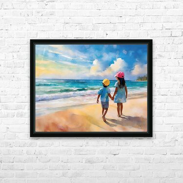 This summery watercolor shows a big sister holding her brothers hand and talking to him as they look out over the ocean. There is nothing like the te...[+]