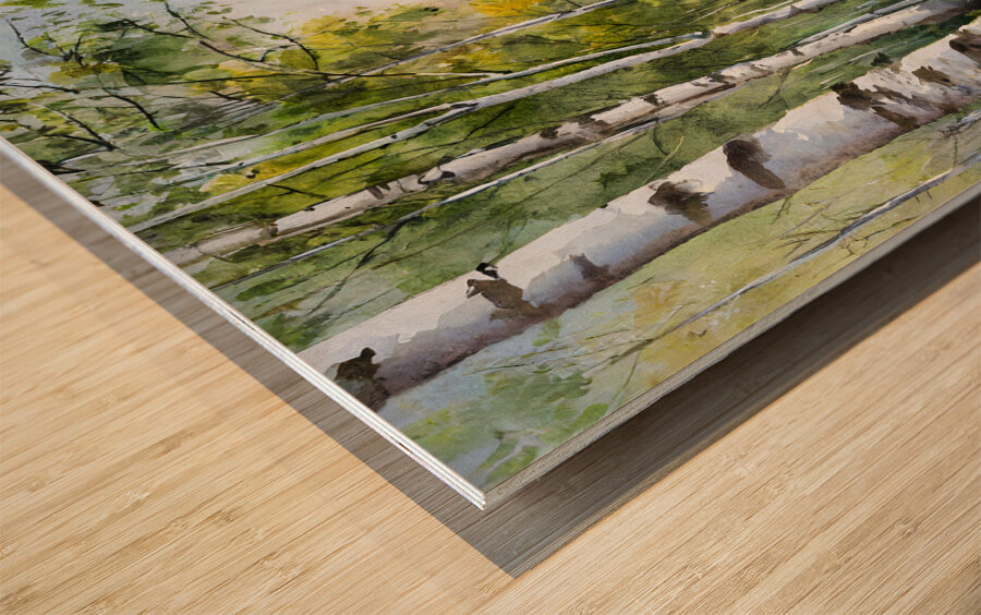 This quiet peaceful watercolor is a favorite path through the birch trees. There is an old stone wall a rocky path and beautiful birches with their a...[+]