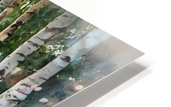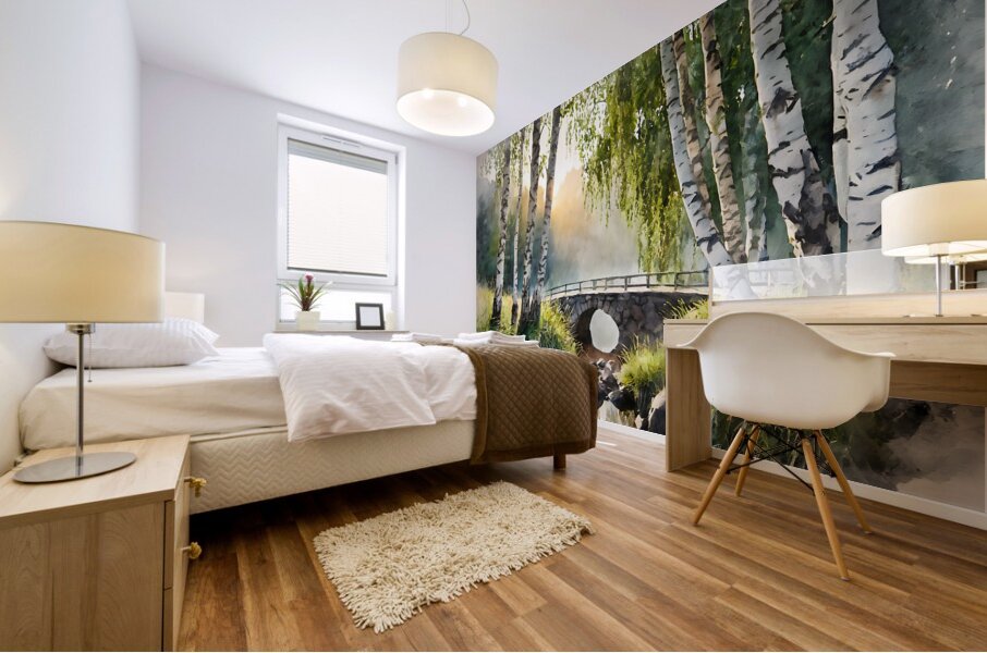 A beautiful foot path with an arched stone bridge is stretched across a small lake. Surrounded by beatiful birches and tall grasses, this watercolor is a scene of calmness and reflection. Choose your preferred size, media, and finishes and bring this magical green idyllic scene into your home or office today.
