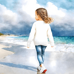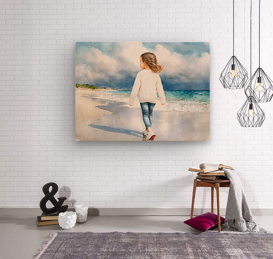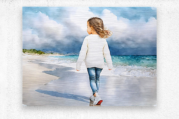 A young girl is walking the beach in Florida on what is a blustery winter day. No need for a coat but a sweater will do to protect her from the chilly breeze. This watercolor image looks amazing on any wall. You can choose your desired media and the size to fit your needs, and bring this charming artist print into your home or office today.