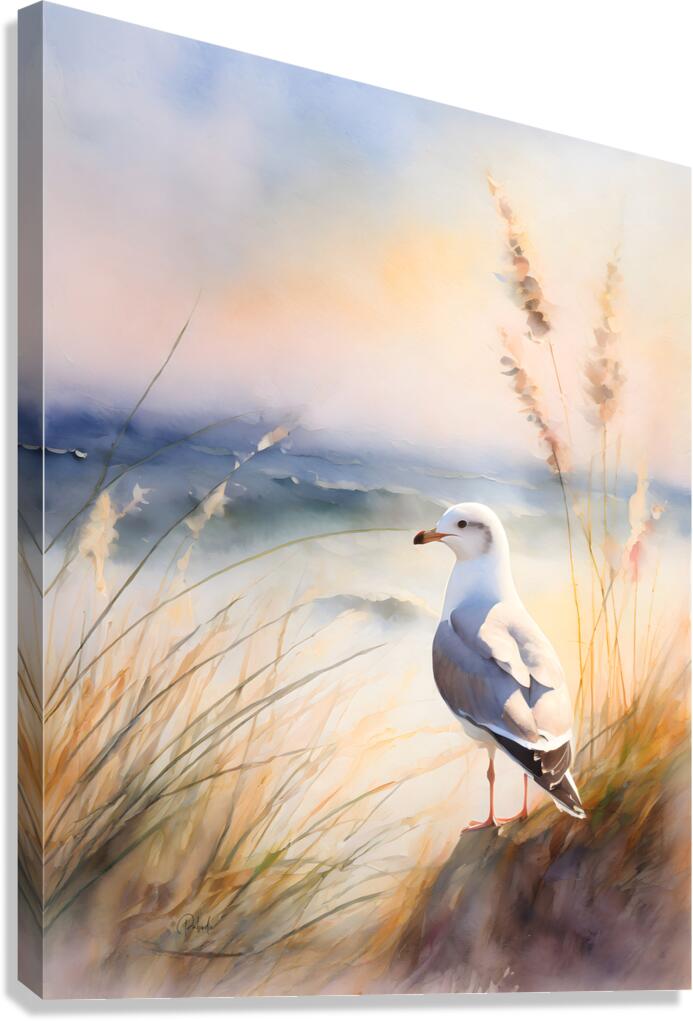 This handsome seagull has found a perch allowing him to see over the seagrass as he searches for his next possible meal. Its a good spot for him to chill and enjoy the ocean breezes. This Pabodie Artist Print is available in your choice of size and media including canvas, metal, acrylic, wood, framed and more. Bring this calming, natural shoreline image into your home or office today.