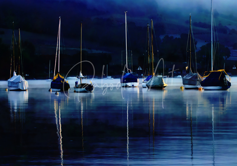 SAILBOATS AND MOORING BUOYS AT DUSK