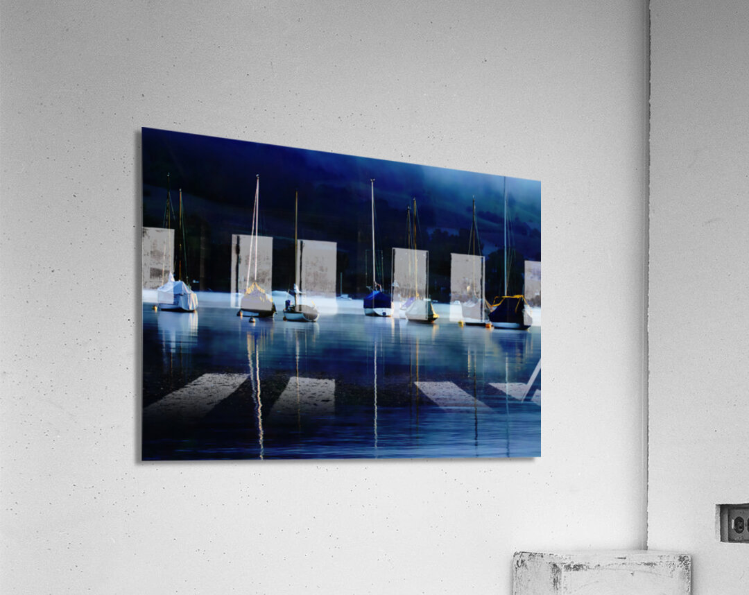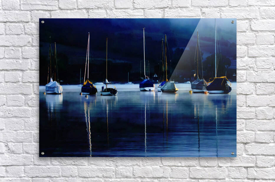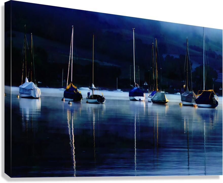 Sailboats are moored in the still waters as dusk decends along the beach. Its a deep navy blue sky that reflects the tall masts of the sailboats onto the waters below. This peaceful scene is calming as you gaze upon the deep waters that are home to these boats. Available in your choice of sizes and media finishes this Pabodie Artist Print will make a wonderful addition to your home or office for many years to come.