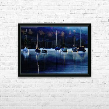 Sailboats are moored in the still waters as dusk decends along the beach. Its a deep navy blue sky that reflects the tall masts of the sailboats onto...[+]