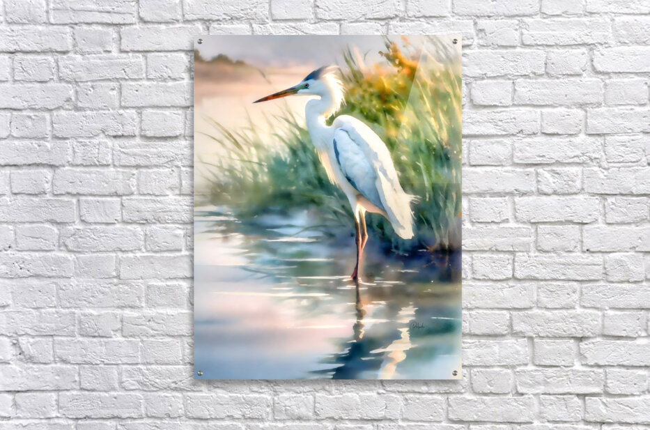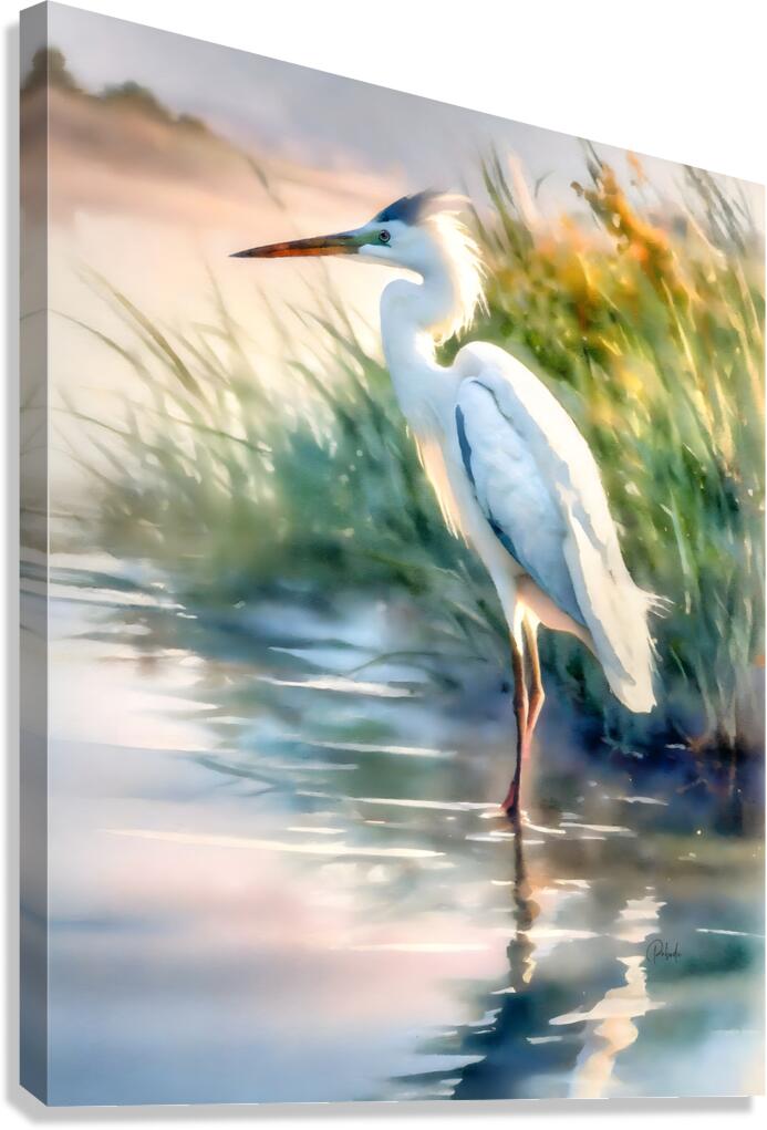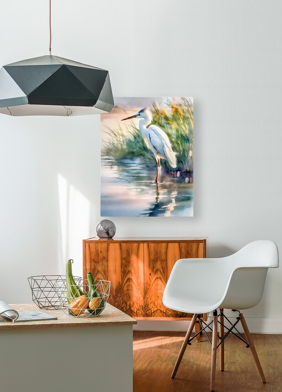 Standing still at attention in the light morning breeze, this egret is on high alert as he intently watches the waters for his next meal. Moving slowly and methodically egrets silently hunt and then suddenly you will see them move as quick as a flash, capturing a fish between their bills. Allow this majestic bird to grace your home or office wall and enjoy his presence for generations to come.