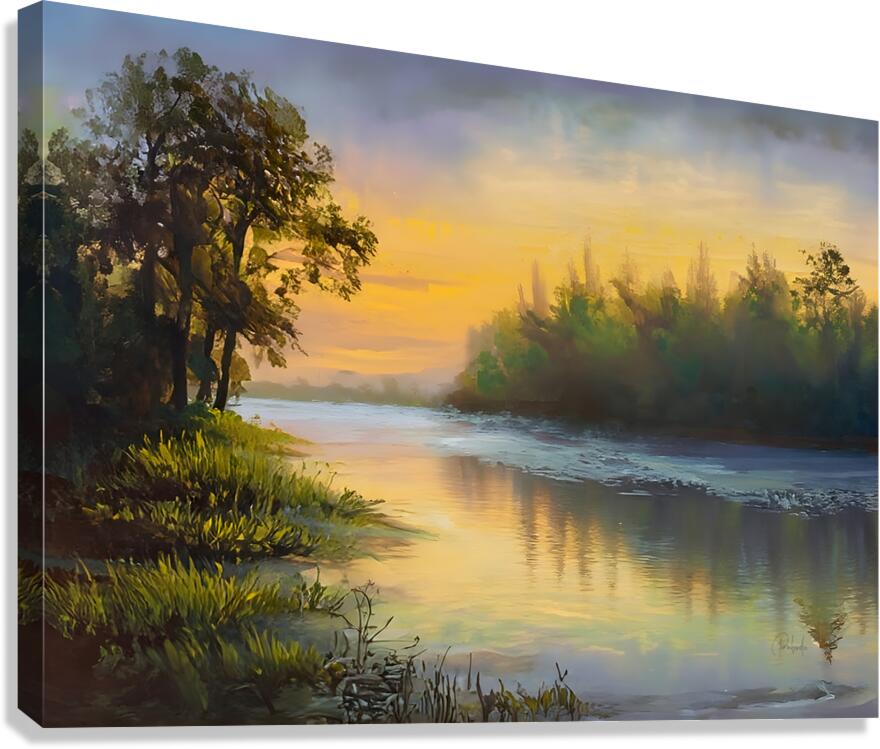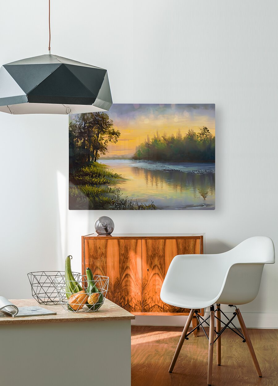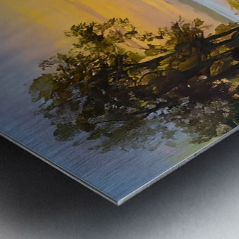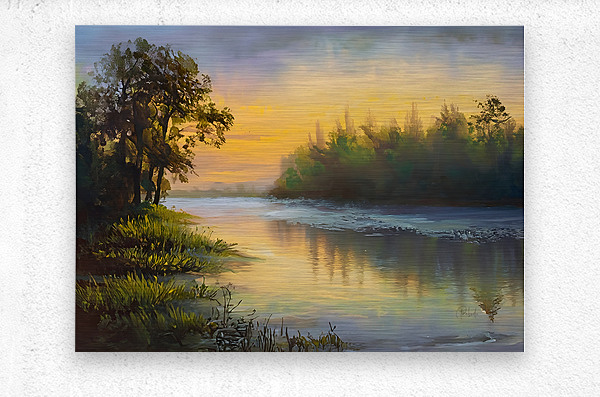 Its a beautiful sunrise reflecting over the icy lake. The trees are mirrored in the partially melted waters while the ice continues to hold out for another cold day. This is a calming winter scene along the Huron River. Bring this lovely painting home as an artist print available in your choice of size and media.