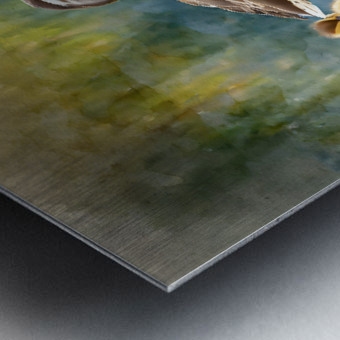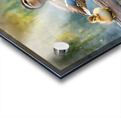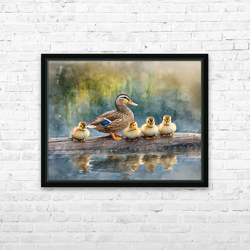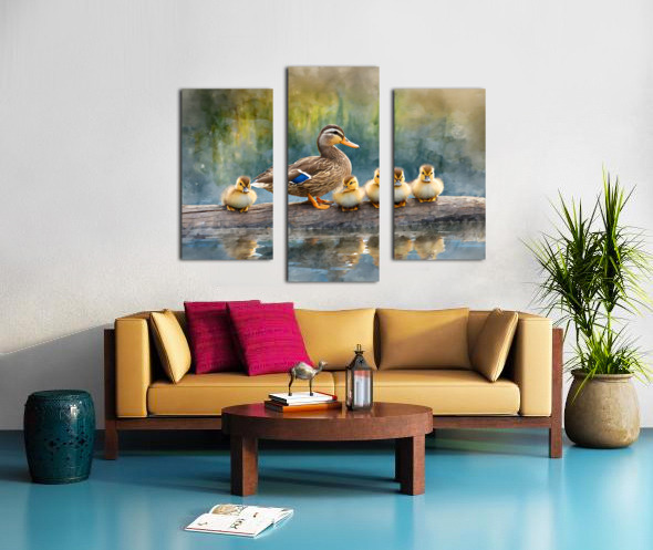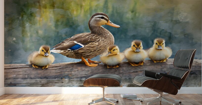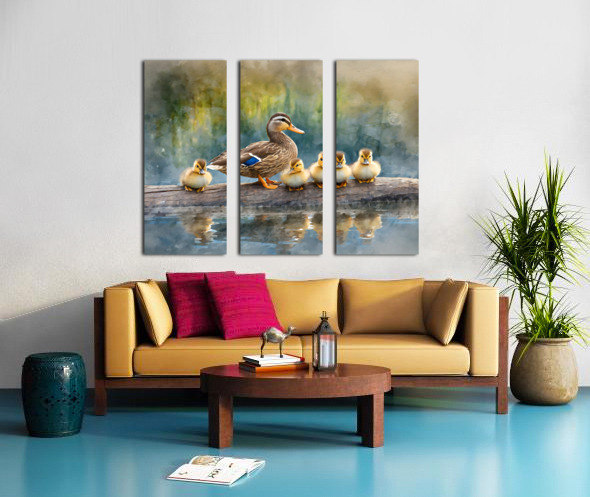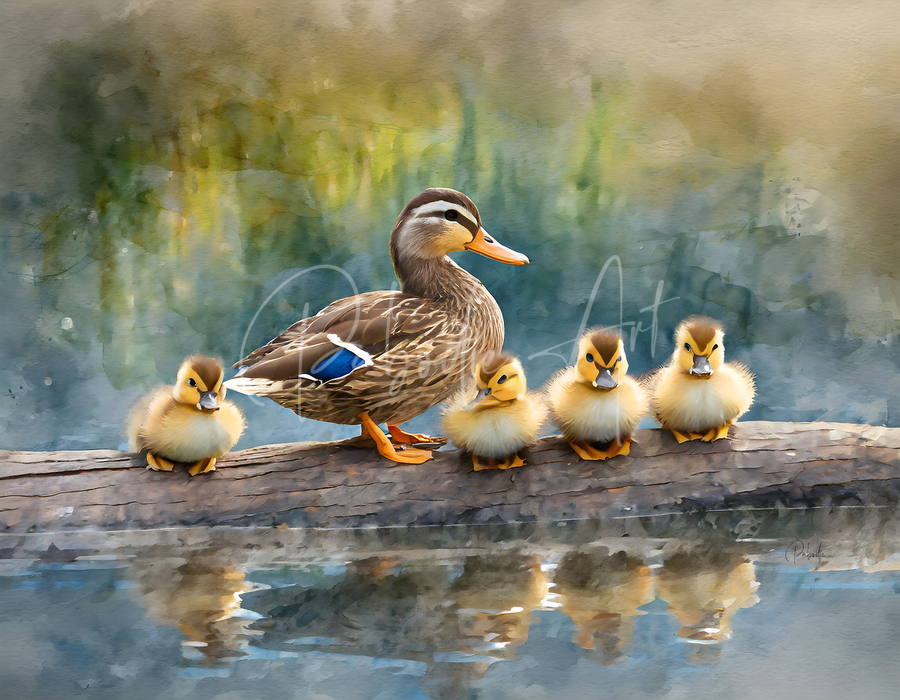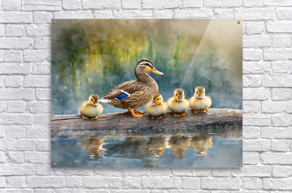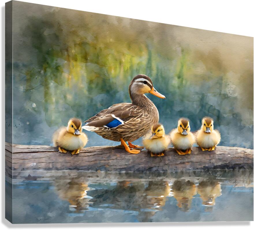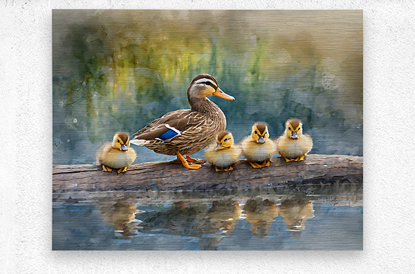 This is a watercolor paintingof a mallard duck family with mama and her bright yellow baby ducks sitting on a floating log in a colorful lake setting. Bring home this charming Pabodie artist print to your home or office today. Available in your custom choice of media and sizes choose your finishes for that perfect wall that is waiting!